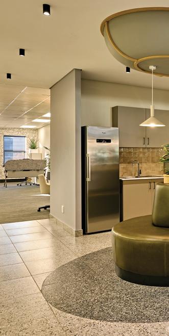 Natural light and views out over the treetops to the Sandton CBD beyond create a sense of wellbeing and connection to the city, imparting a sense of place. Plants bring greenery into the interior environment, along with all their biophilic benefits.