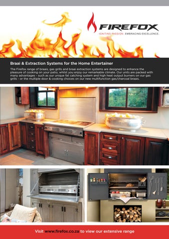 Braai & Extraction Systems for the Home Entertainer The Firefox range of braais, gas grills and braai extraction systems are designed to enhance the pleasure of cooking on your patio, whilst you enjoy our remarkable climate. Our units are packed with many advantages - such as our unique fat catching system and high heat output burners on our gas grills - or the multiple door & cooking choices on our new multifunction gas/charcoal braais.