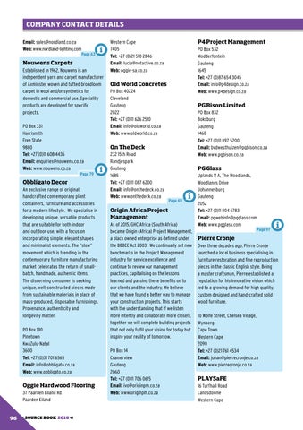 Nouwens Carpets Established in 1962, Nouwens is an independent yarn and carpet manufacturer of Axminster woven and tufted broadloom carpet in wool and/or synthetics for domestic and commercial use. Speciality products are developed for specific projects. PO Box 331 Harrismith Free State 9880 Tel: +27 (0)11 608 4435 Email: enquiries@nouwens.co.za Web: www.nouwens.co.za Page 79
