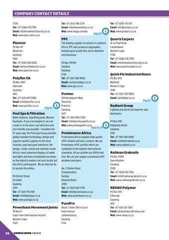 Prominance Africa Prominance Africa supplies high quality uPVC window and door systems. We use Prominance uPVC profiles which are compliant to the highest international standards. All our profiles are 100% lead free. We can also supply customised uPVC windows and doors. No. 2 Station Road Compensation Durban KwaZulu-Natal 4390 Tel: +27 (0)31 569 1790 Email: info@prominance.co.za Web: www.prominance.co.za