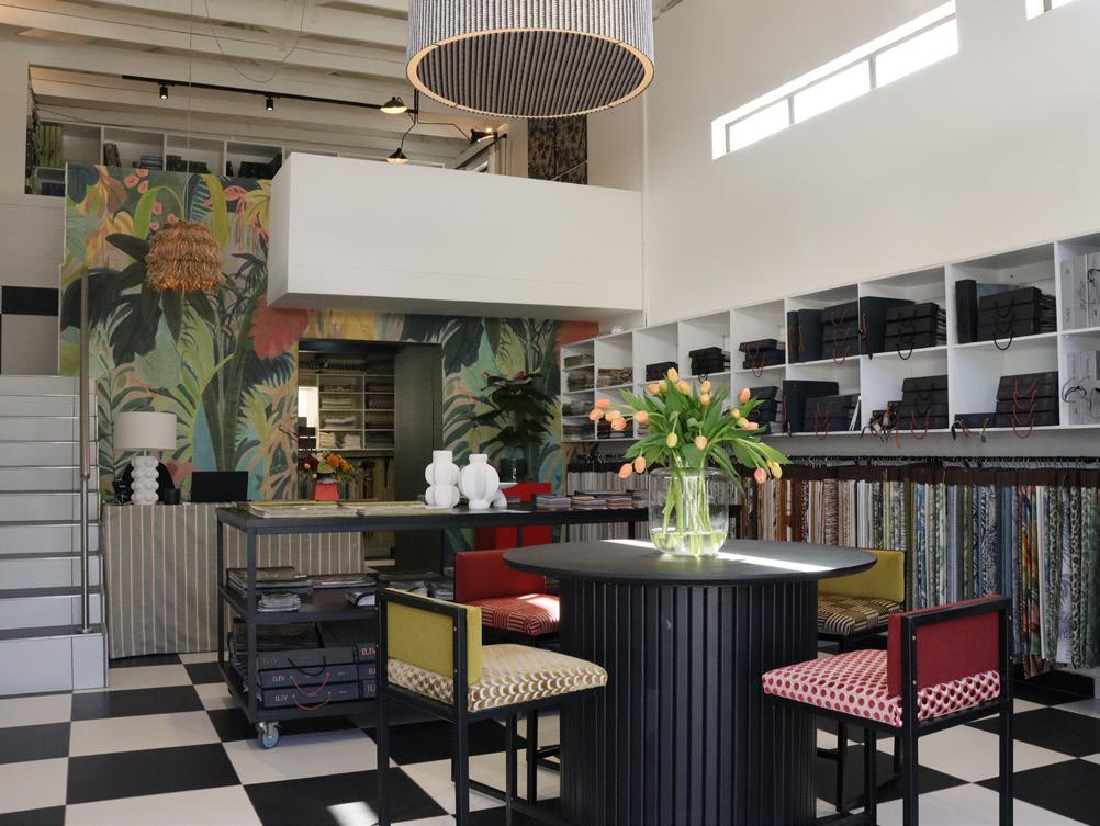 The showroom features walls dressed in standout designs from St Leger & Viney’s collections, including Ardmore’s vibrant Hoopoe Leaves wallpaper and Thibaut’s dramatic Forest Mural grass cloth. Shelves are filled with sample books showcasing a rich variety of textures and colours. Whether you’re updating a home or managing a large-scale project, this space is designed to inspire creativity and make the design process easier.