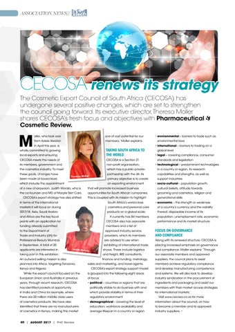 CECOSA renews its strategy The Cosmetic Export Council of South Africa (CECOSA) has undergone several positive changes, which are set to strengthen the council going forward. Its executive director, Theresa Moller shares CECOSA’s fresh focus and objectives with Pharmaceutical Cosmetic Review.
