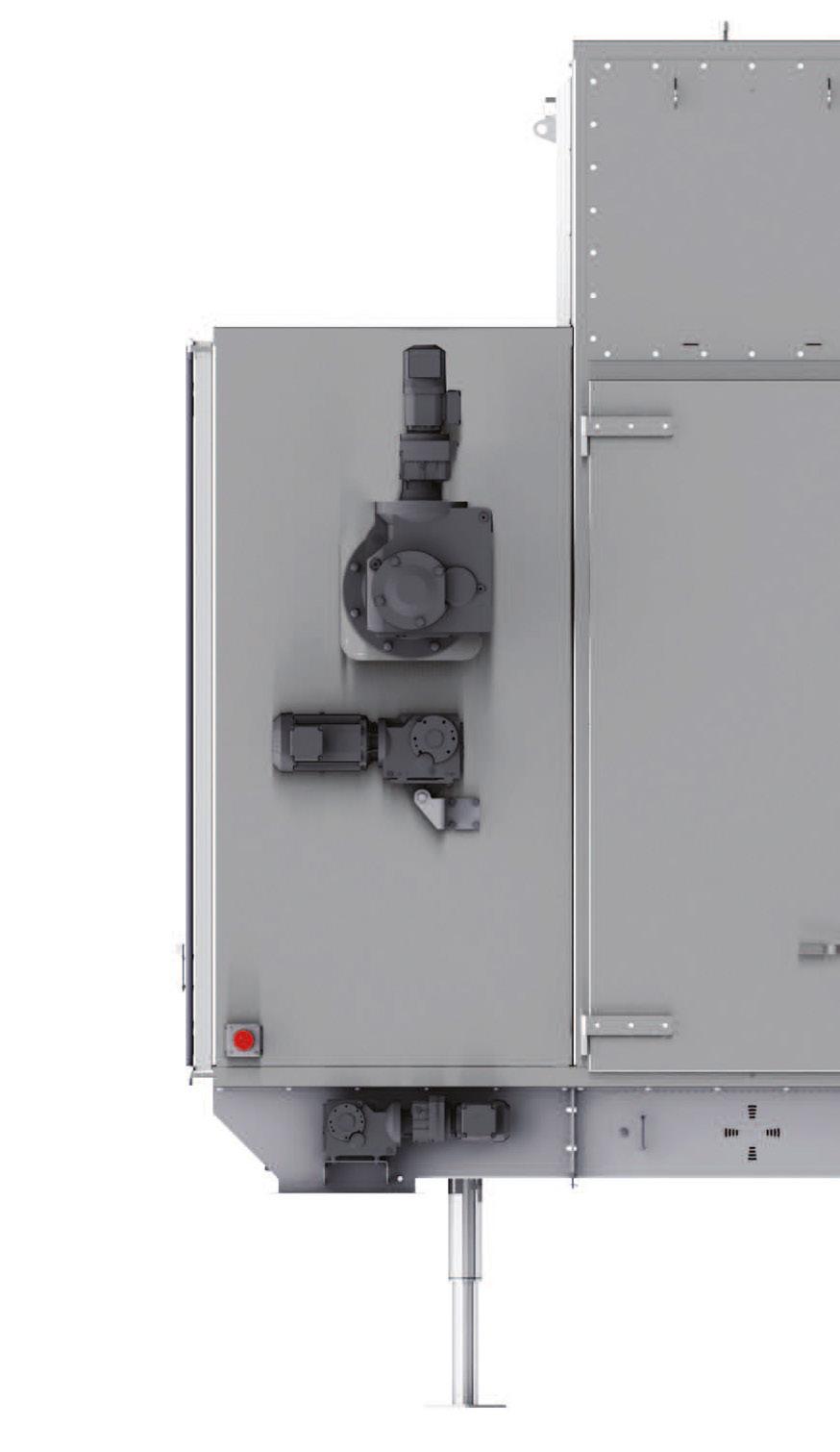 Increased access for maintenance: Downtime for cleaning can eat into valuable production time. The Solis has been designed to shorten the cleaning cycle as much as possible while still providing a food-safe drying process. The innovations in this area include an increase in the distance between the lower conveyor and the dryer floor, which provides greater access; large inner and outer doors that make for quick, easy, and effective cleaning; and a unique support structure that puts fewer feet to the factory floor, making cleaning beneath the dryer much easier.