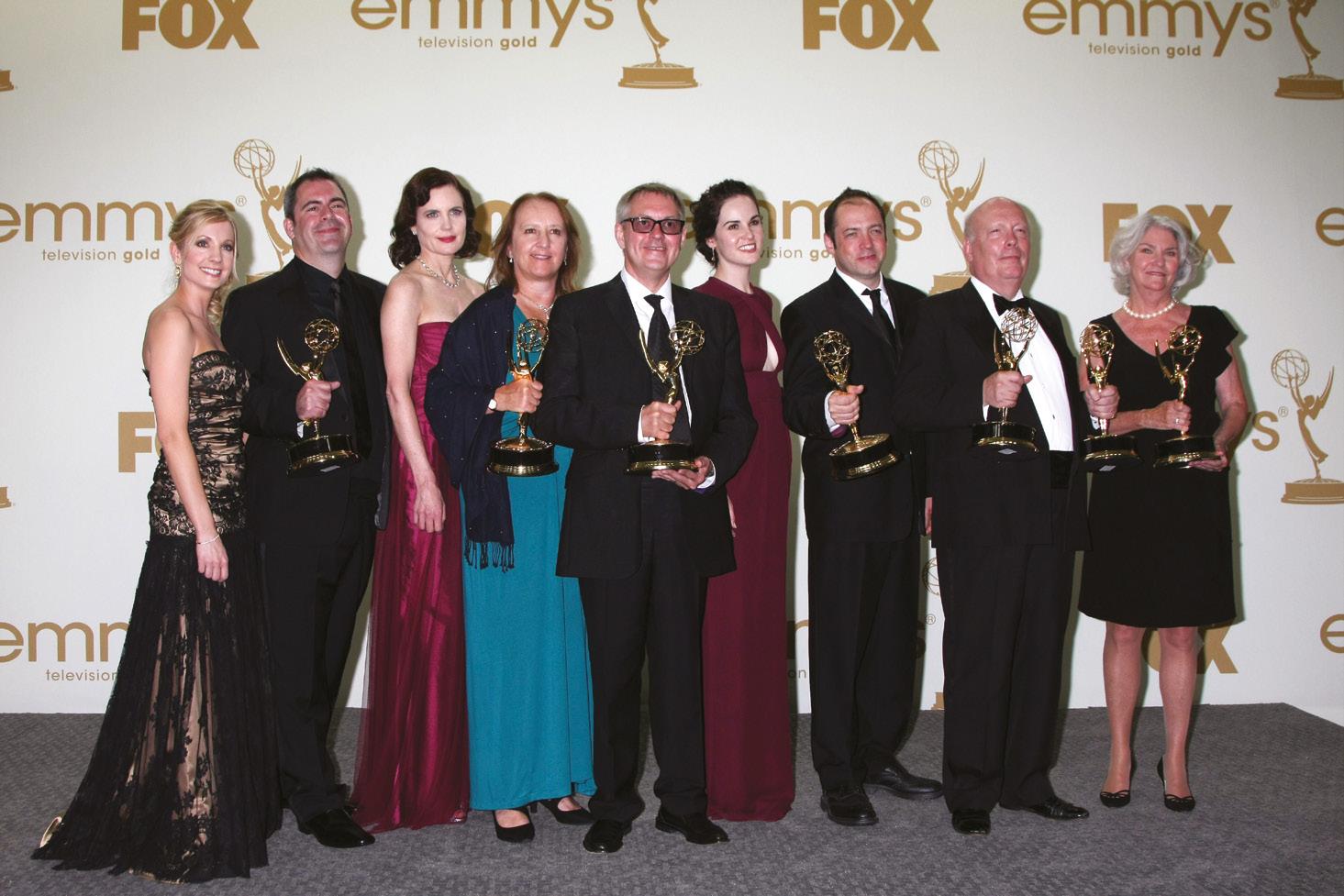 Members of the cast and producers of Downton Abbey with Julian Fellowes (second from right) at the 2011 Emmy Awards.