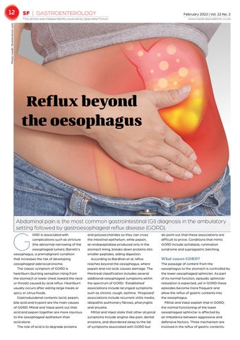 and polysaccharides so they can cross the intestinal epithelium, while pepsin, an endopeptidase produced only in the stomach lining, breaks down proteins into smaller peptides, aiding digestion. According to Bardhan et al, reflux reaches beyond the oesophagus, where pepsin and not acid, causes damage. The Montreal classification includes several additional oesophageal symptoms within the spectrum of GORD. ‘Established’ associations include laryngeal symptoms such as chronic cough, asthma. ‘Proposed’ associations include recurrent otitis media, idiopathic pulmonary fibrosis, pharyngitis and sinusitis. Mittal and Vaezi state that other atypical symptoms include angina-like pain, dental erosions, and disordered sleep to the list of symptoms associated with GORD but
