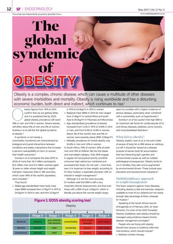 besity figures from 1975 to 2014 confirm that we are getting fatter, and it is predicted that by 2025, global obesity prevalence will reach 18% in men and 21% in women. Severe obesity will affect about 6% of men and 9% of women. Swinburn et al call this the ‘global syndemic of obesity’. 2 A syndemic is not merely a comorbidity. Syndemics are characterised by biological and social interactions between conditions and states, interactions that increase a person’s susceptibility to harm or worsen their health outcomes. 3 Swinburn et al compared the data (1975 to 2014) of more than 19.2 million participants (9.9 million men and 9.3 million women) aged 18 years or older whose height and weight had been measured. Data in 186 countries, which cover 99% of the world’s population, were included. 2 They found: » Global age-standardised mean body mass index (BMI) increased from 21.7kg/m2 in 1975 to 24.2kg/m2 in 2014 in men, and from 22.1kg/m2