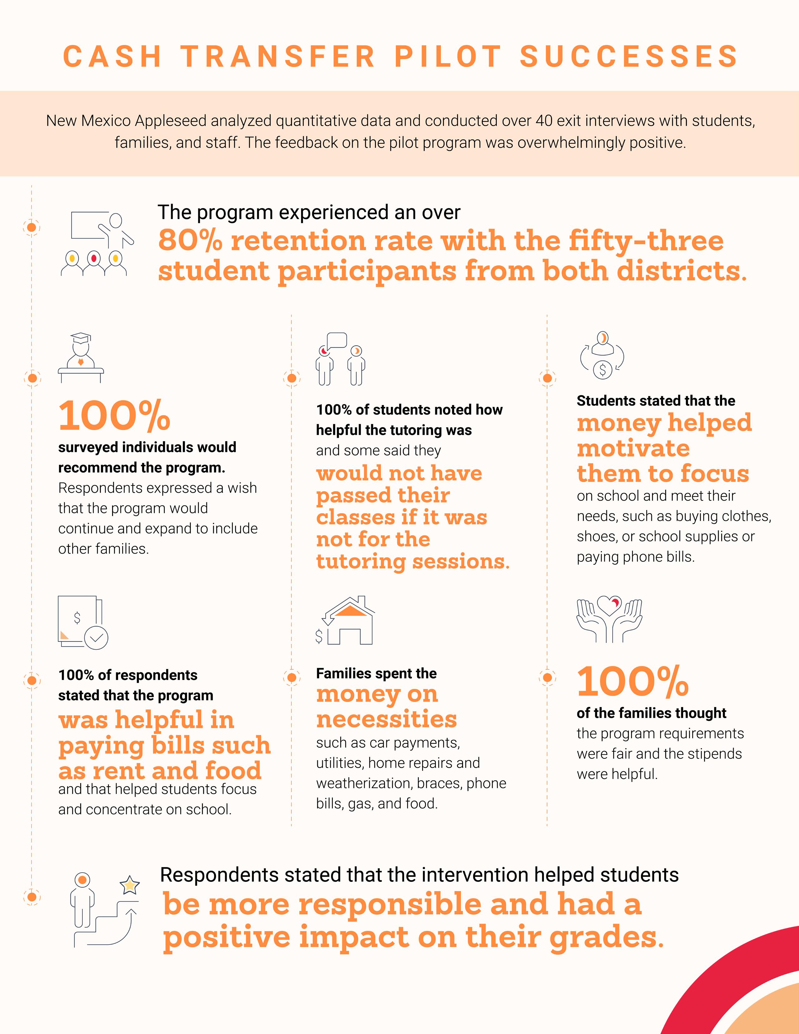 Paying inadequately housed students to go to school pilot (Page 14): New Mexico Appleseed partnered with two rural school districts in Northern New Mexico to support 53 students during the 2020-2021 school year with tutoring, social-emotional support, and $500 a month. Students and families reported greater engagement with school in part due to the tutoring and shared how helpful the cash transfer was to meet their basic needs such as rent, clothes, and medical bills.