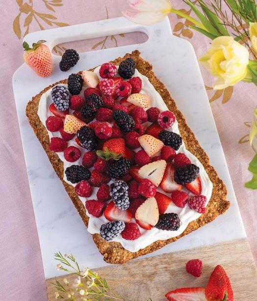 3. For topping assembly, in medium bowl, whisk to combine skyr or yogurt, honey, and vanilla. Spread yogurt mixture over cooled crust, leaving a small border. Cover and chill in refrigerator until ready to serve, at least 1 hour and up to 3 hours—the time in the fridge makes for a softened crust that’s easier to cut and eat.