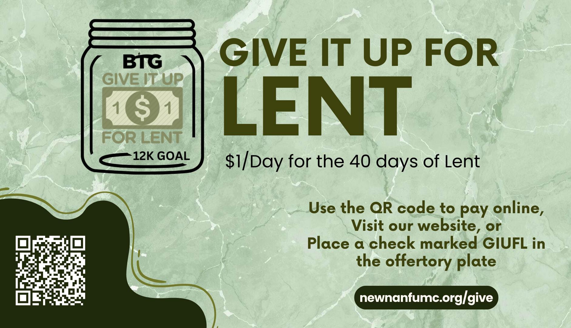Give It Up For Lent | February 18-Easter Sunday This is the biggest fundraiser of the year our church has for Bridging The Gap (BTG). How does it work, you ask? We are asking everyone to donate $40, representing the 40 days of Lent. You can give online. Or place your check or cash in the offering plate marking it GIUFL.
