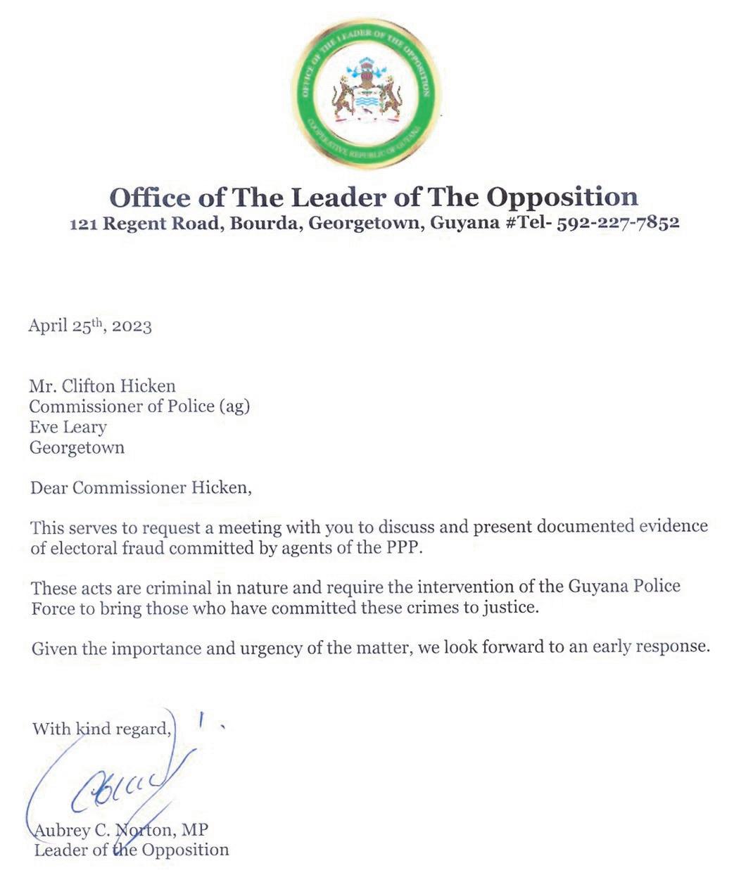 The letter below was sent to the Commissioner of Police (ag) Mr. Clifton Hicken by the APNU requesting a meeting to present the evidence of electoral fraud and to demand that the police take action against the fraudsters and their controllers at Freedom House.