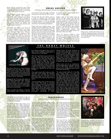 cleaner, better. We make decisions in seconds that would take a band of six people a week to figure out, because it’s just the two of us running this show and we’re constantly together. Other bands have to bounce ideas around, schedule rehearsals, email each other, return phone calls, all kinds of bullshit to achieve the same results.” Others may not be so enthusiastic about playing music with their spouse, but to The Ghost Wolves, it’s the perfect way to merge their personal life with their musical life. “So many people think it’s a horrible idea,” Jonny recalls. “I’ve even had family members and close friends point the finger and tell me I’m an idiot for starting a band with my wife: the whole mixing business with your relationship, family, etc. I think that’s bullshit. If you can’t work closely with your spouse, why the fuck did you marry them in the first place? I didn’t marry Carley so I could see her every once in a while, after work or after a tour with another band. I have a huge admiration for her personally and creatively, and am super lucky that we have the chance to do what we are doing right now and love it.”