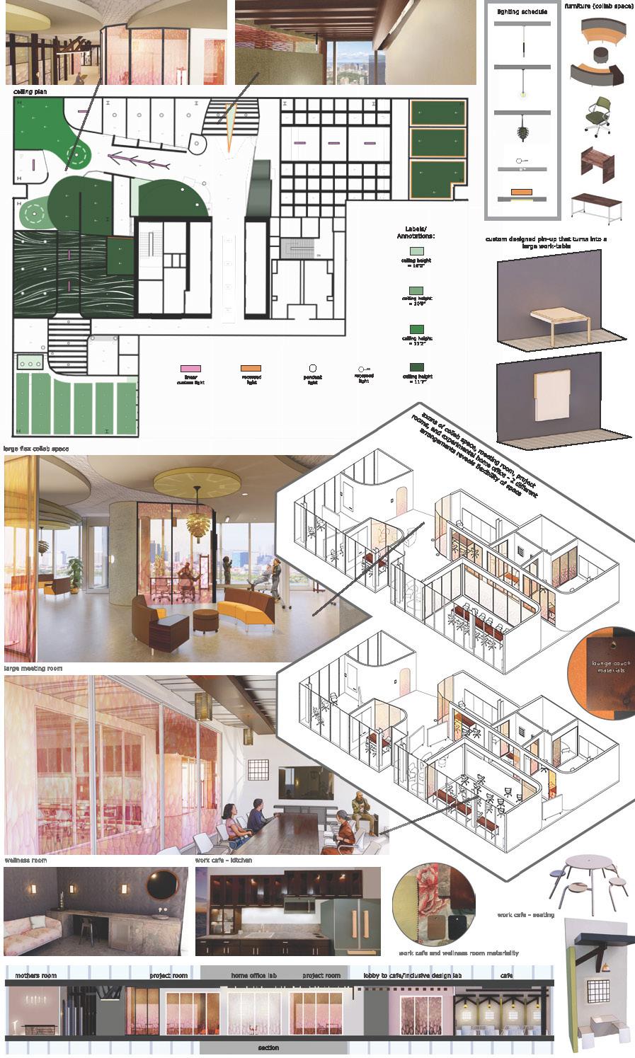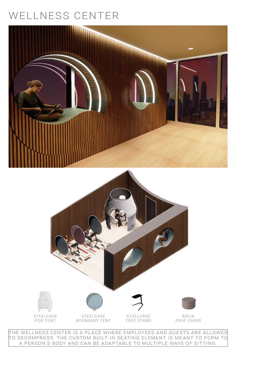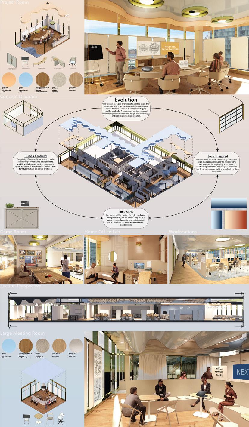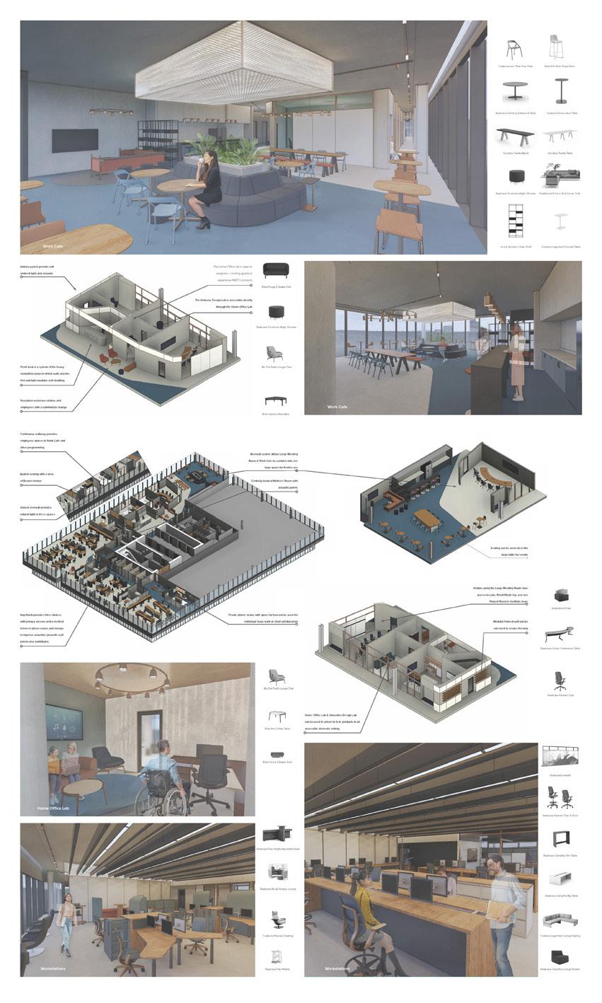 There were some notable projects that began this dialog of the post-pandemic workspace both physical and virtual even though the program the students were given resembled a prepandemic workplace archetype. The students’ projects stayed true to the intended program. In that respect, most of their projects met the criteria of the Steelcase competition, and a couple was exceptional with strong and novel concepts. Their space planning was mature and convincing. The overall presentation was beautifully executed and presented verbally with confidence and clarity.