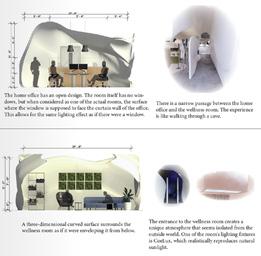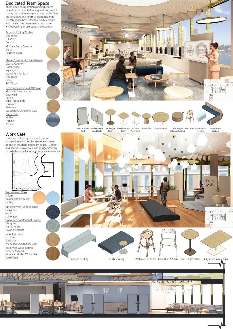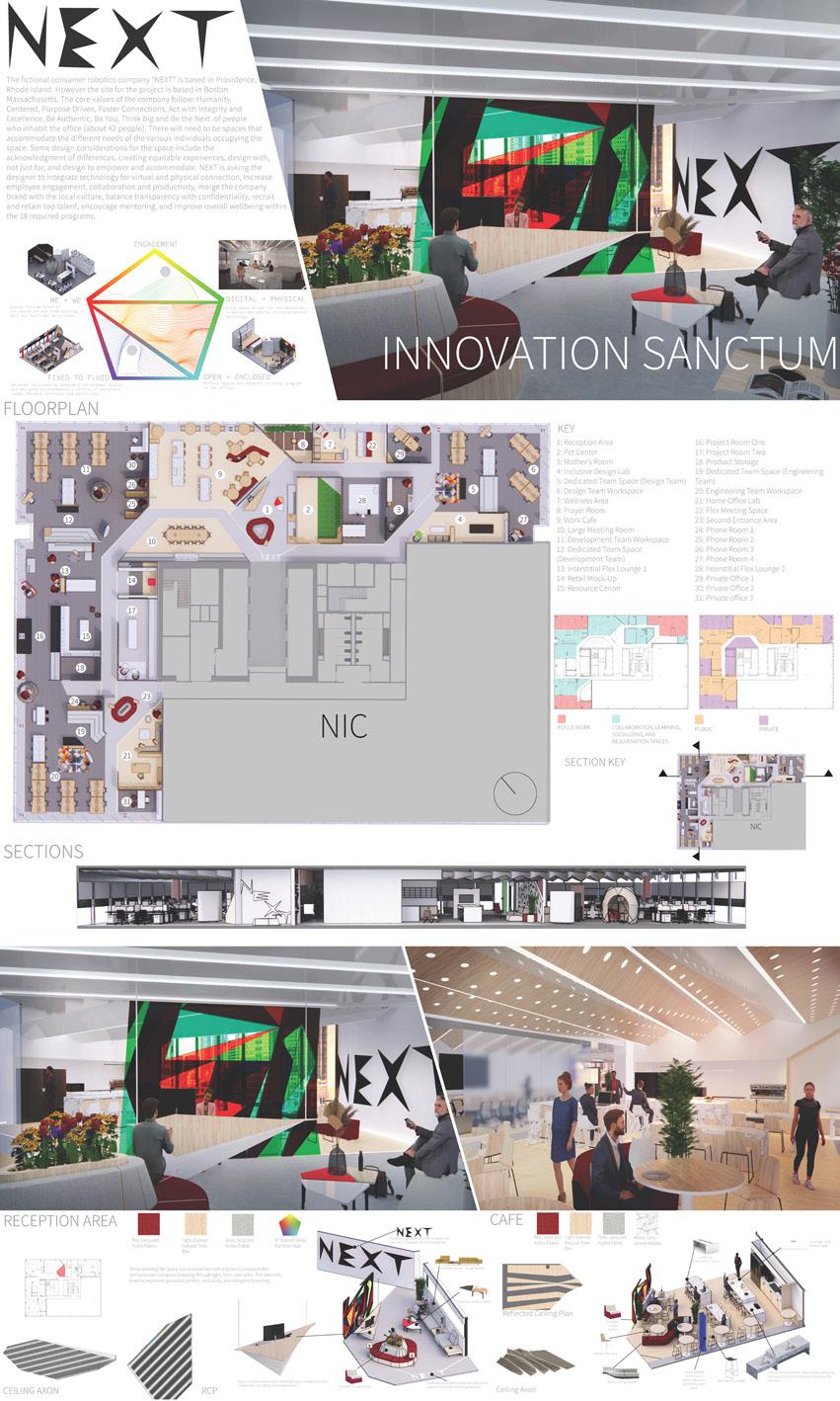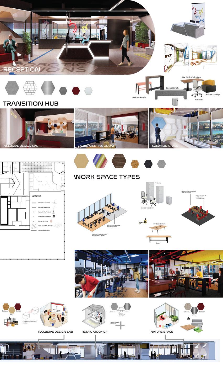 There were some notable projects that began this dialog of the post-pandemic workspace both physical and virtual even though the program the students were given resembled a prepandemic workplace archetype. The students’ projects stayed true to the intended program. In that respect, most of their projects met the criteria of the Steelcase competition, and a couple was exceptional with strong and novel concepts. Their space planning was mature and convincing. The overall presentation was beautifully executed and presented verbally with confidence and clarity.