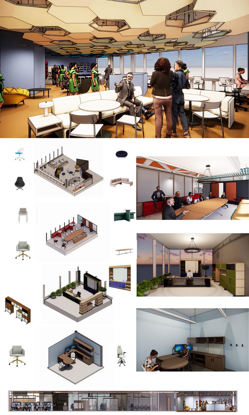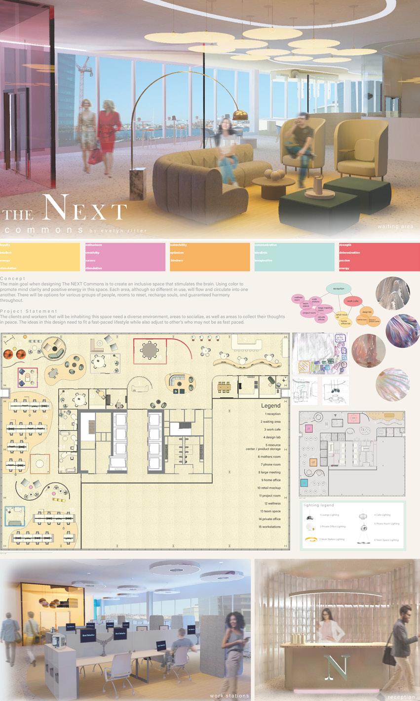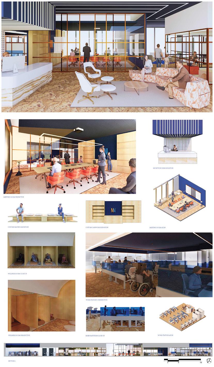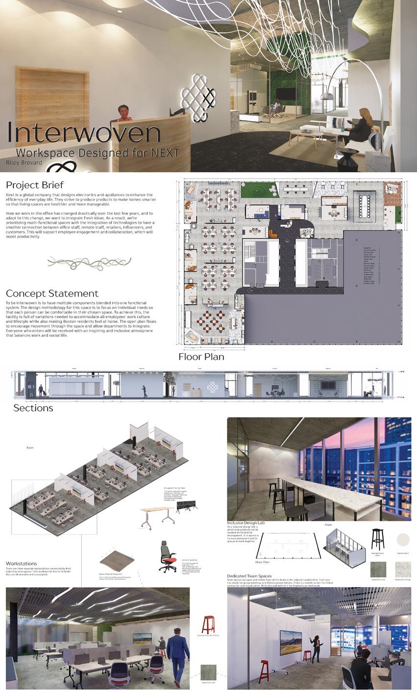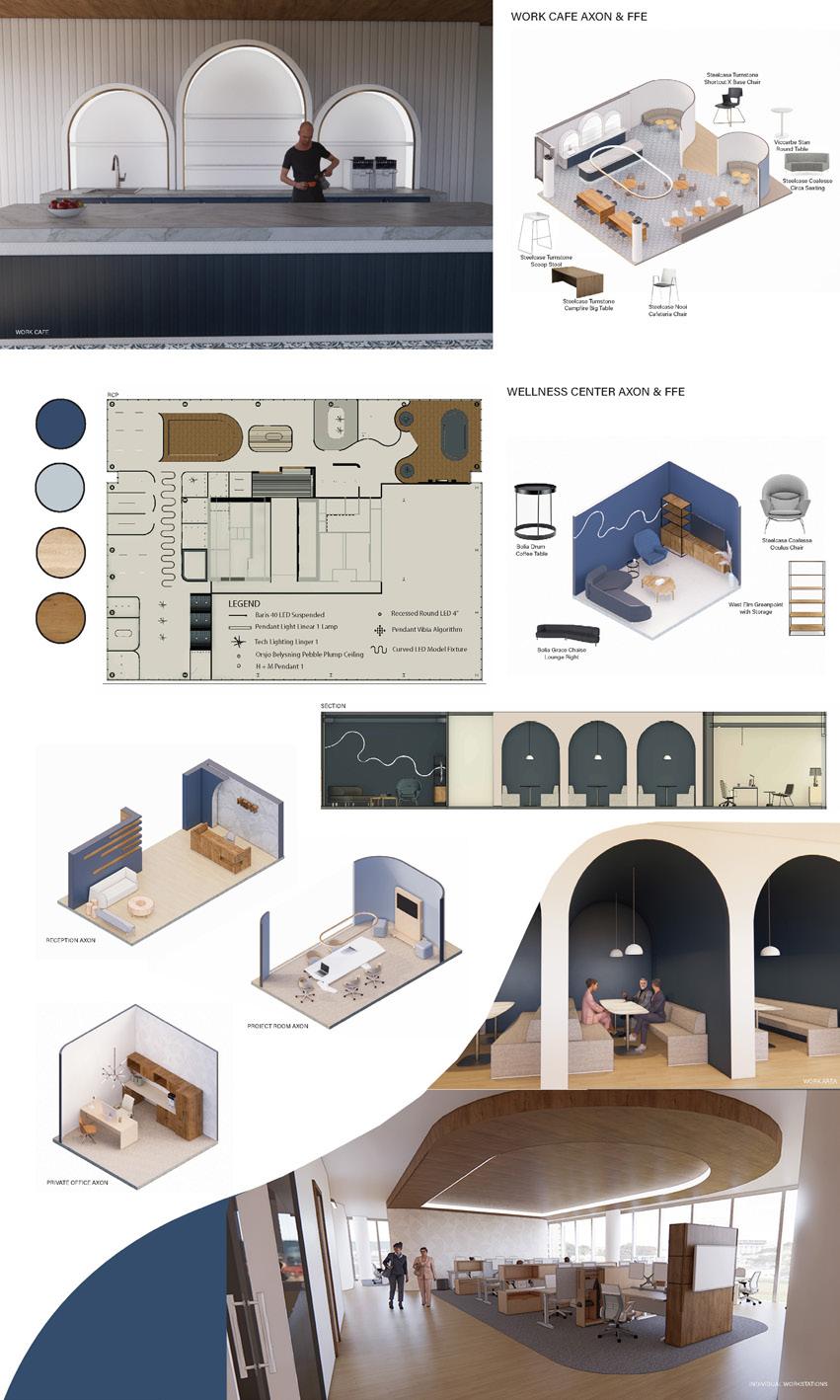 I thoroughly enjoyed every project as they explored and dove deep into the complex reality of a forever changing workplace design after a pandemic. It is encouraging to see design concepts that capture a well-rounded brand but also create a functional space for the end users. When developing these concepts, I encourage the students to dig deeper into the meaning of every element within every space. How can these elements become functional yet stay aesthetically pleasing for the overall brand? I encourage to think outside of the box and stretch the boundaries of the asked points of the client. How can you make what the client needs more intriguing yet functional? Critically develop the design concept and allow it to initiate & dwell in the rest of the design. Good luck to all students!