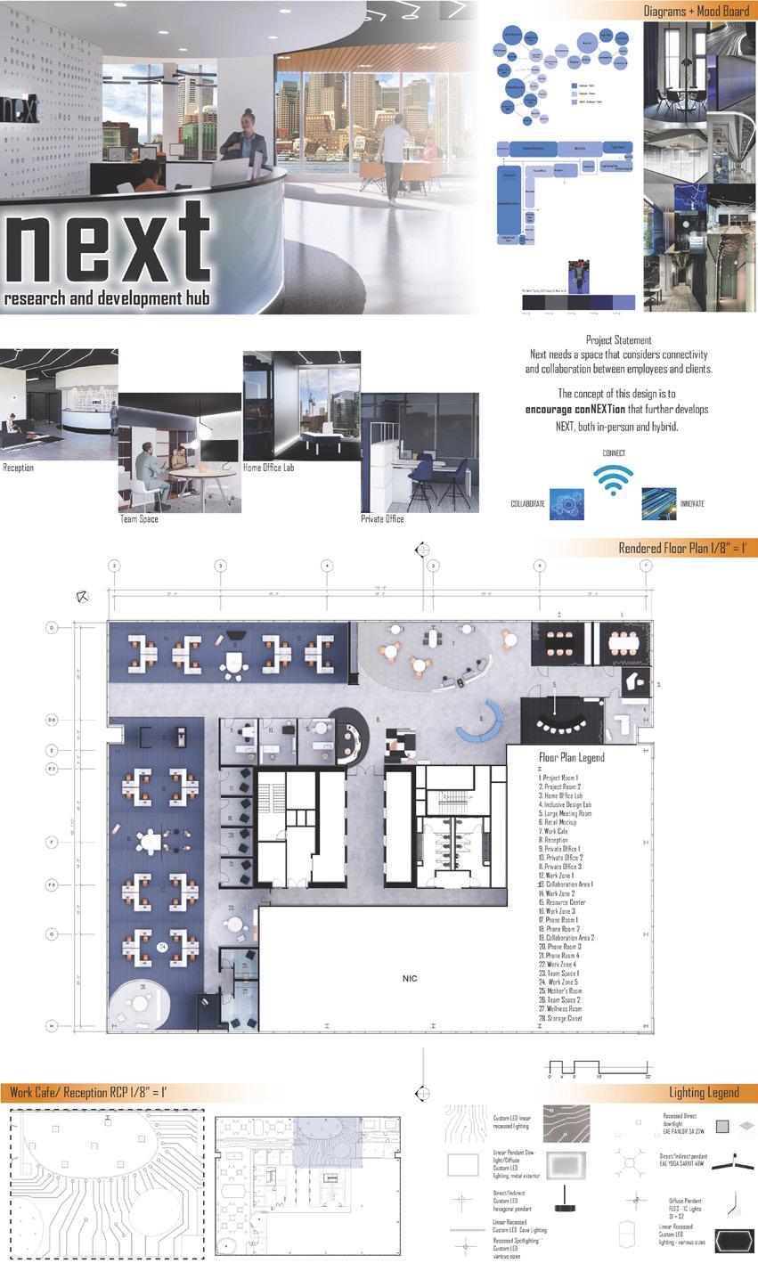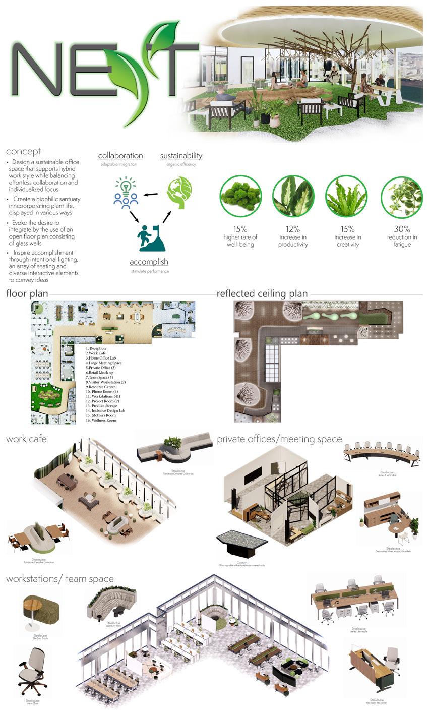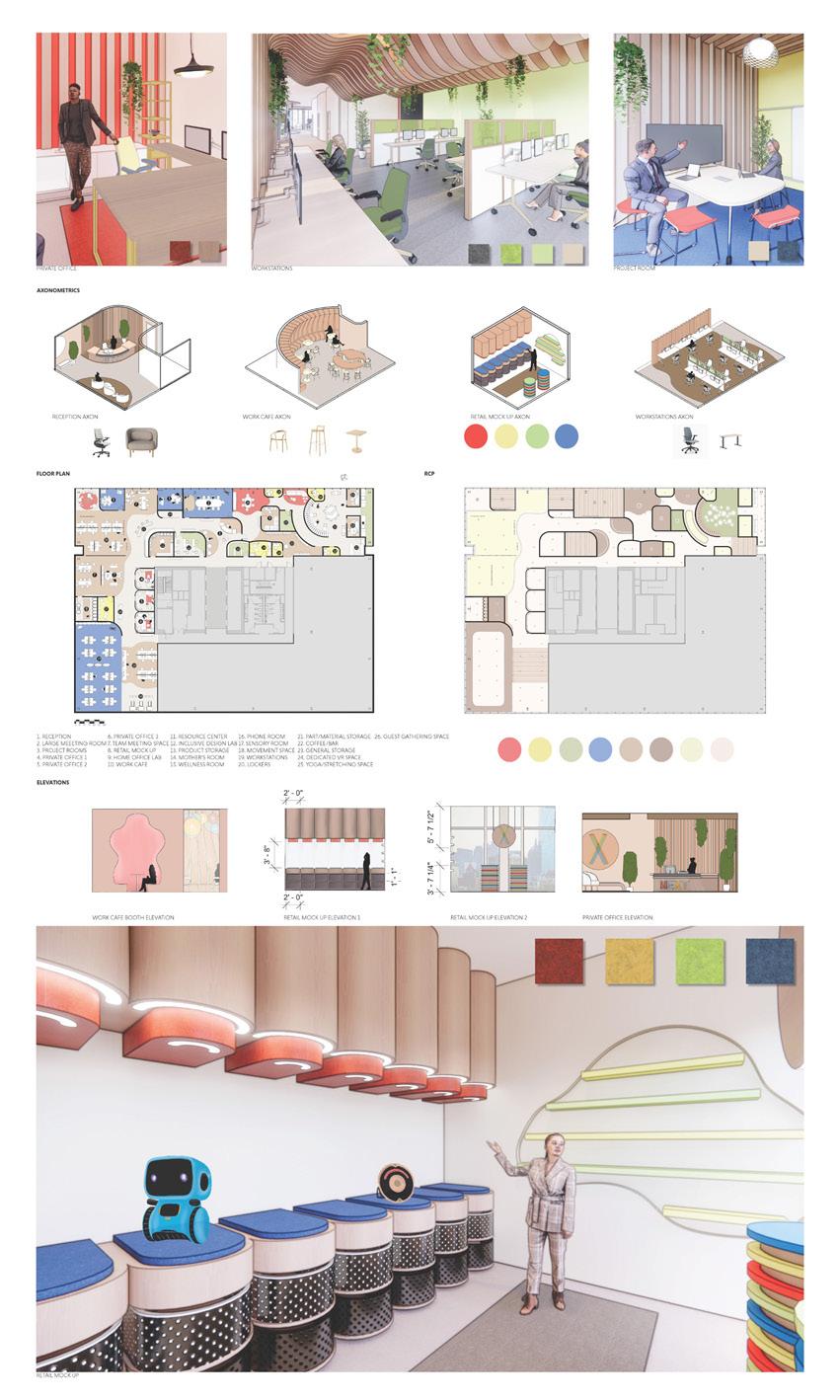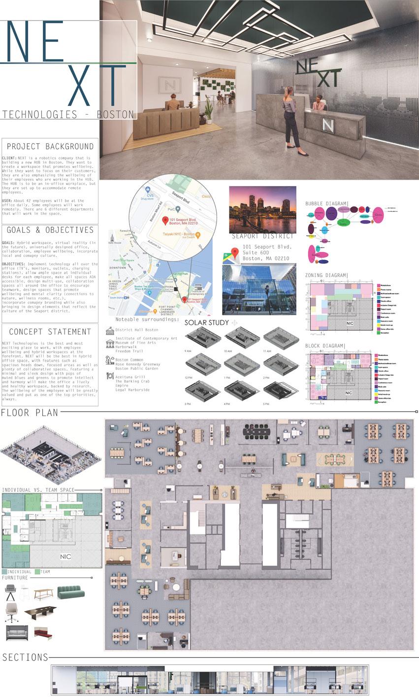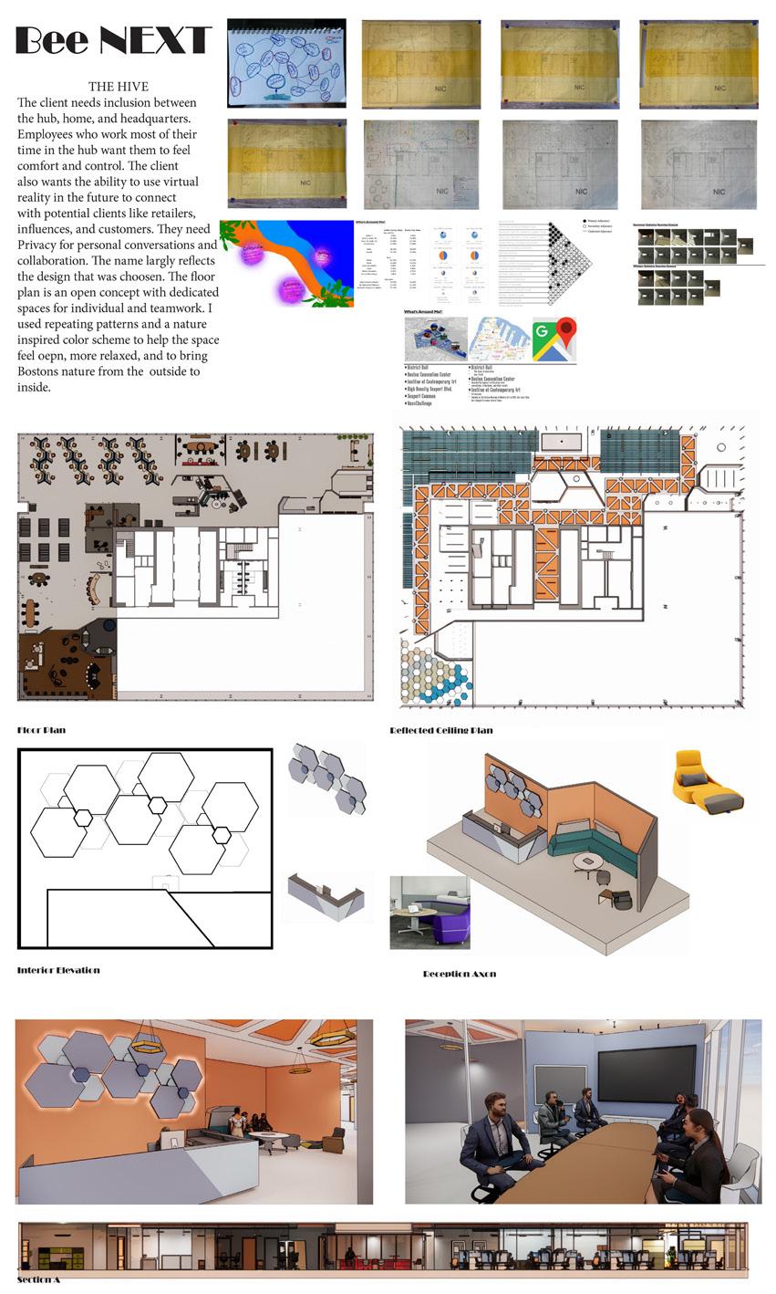 I thoroughly enjoyed every project as they explored and dove deep into the complex reality of a forever changing workplace design after a pandemic. It is encouraging to see design concepts that capture a well-rounded brand but also create a functional space for the end users. When developing these concepts, I encourage the students to dig deeper into the meaning of every element within every space. How can these elements become functional yet stay aesthetically pleasing for the overall brand? I encourage to think outside of the box and stretch the boundaries of the asked points of the client. How can you make what the client needs more intriguing yet functional? Critically develop the design concept and allow it to initiate & dwell in the rest of the design. Good luck to all students!