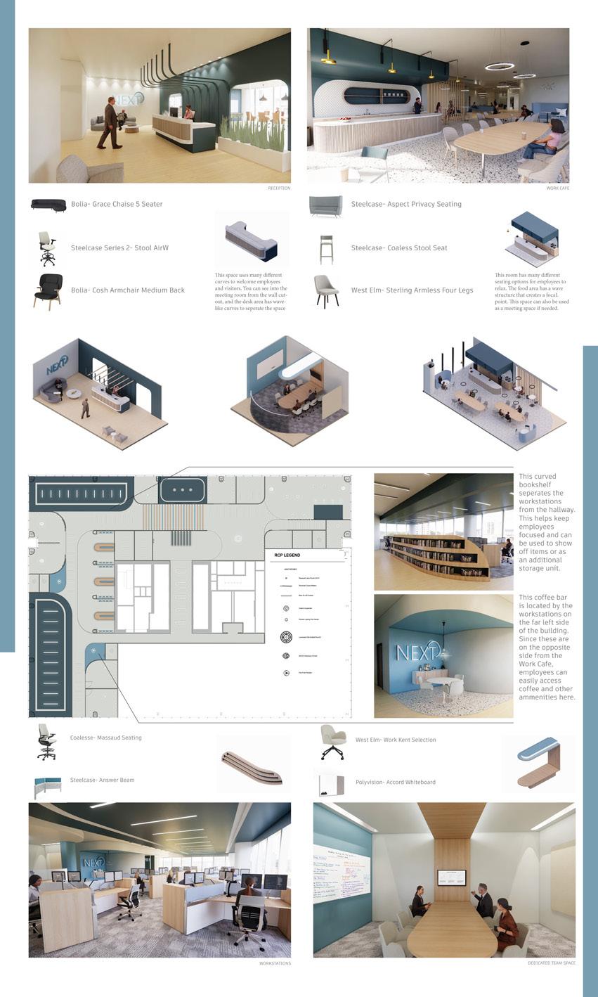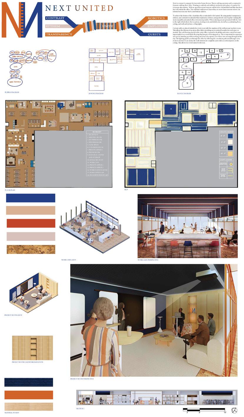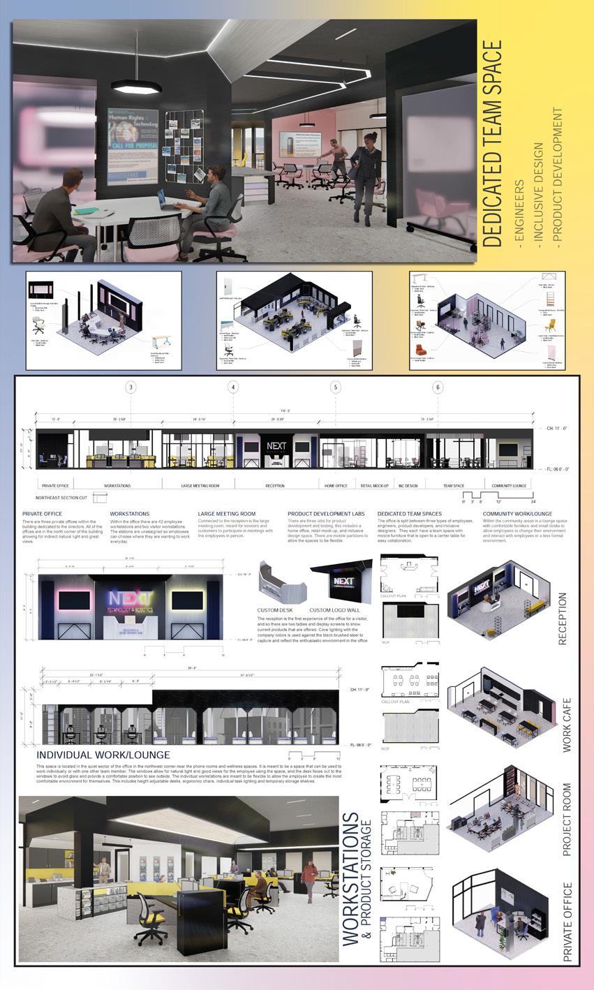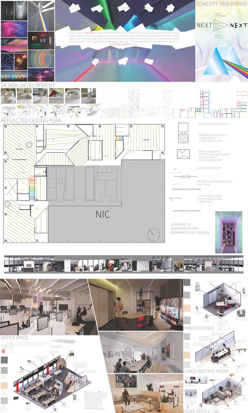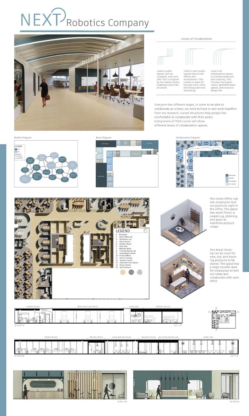I thoroughly enjoyed every project as they explored and dove deep into the complex reality of a forever changing workplace design after a pandemic. It is encouraging to see design concepts that capture a well-rounded brand but also create a functional space for the end users. When developing these concepts, I encourage the students to dig deeper into the meaning of every element within every space. How can these elements become functional yet stay aesthetically pleasing for the overall brand? I encourage to think outside of the box and stretch the boundaries of the asked points of the client. How can you make what the client needs more intriguing yet functional? Critically develop the design concept and allow it to initiate & dwell in the rest of the design. Good luck to all students!