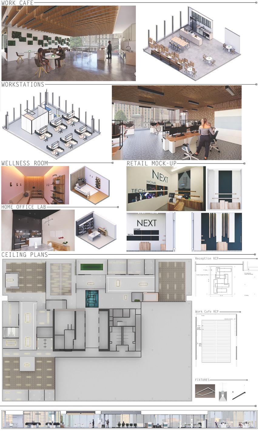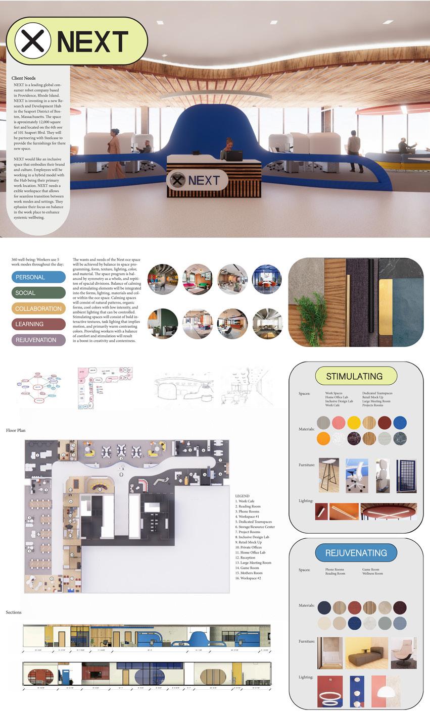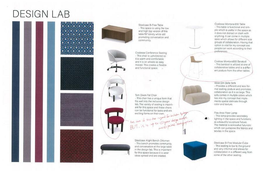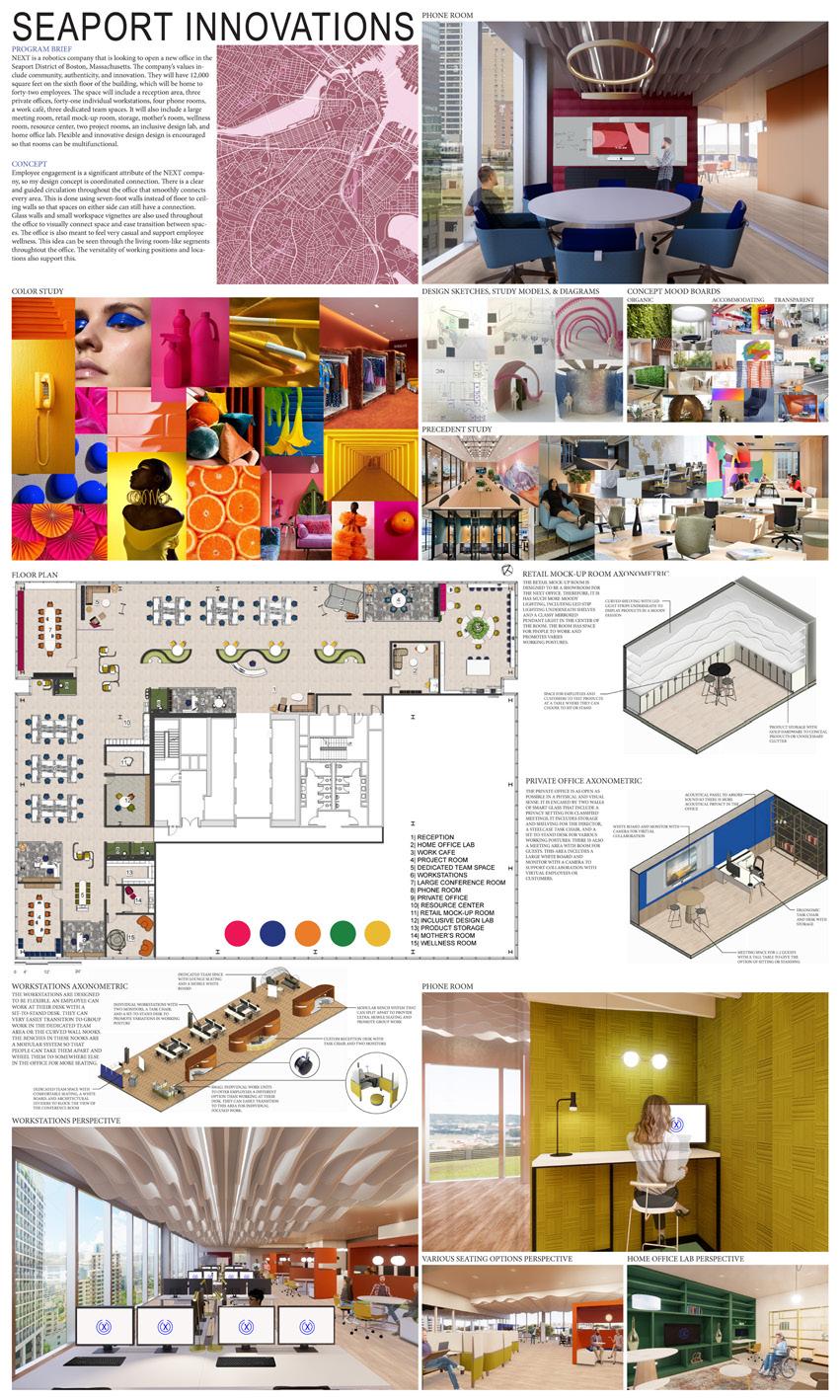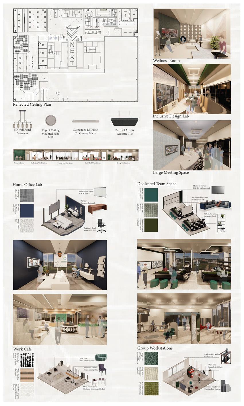 I thoroughly enjoyed every project as they explored and dove deep into the complex reality of a forever changing workplace design after a pandemic. It is encouraging to see design concepts that capture a well-rounded brand but also create a functional space for the end users. When developing these concepts, I encourage the students to dig deeper into the meaning of every element within every space. How can these elements become functional yet stay aesthetically pleasing for the overall brand? I encourage to think outside of the box and stretch the boundaries of the asked points of the client. How can you make what the client needs more intriguing yet functional? Critically develop the design concept and allow it to initiate & dwell in the rest of the design. Good luck to all students!