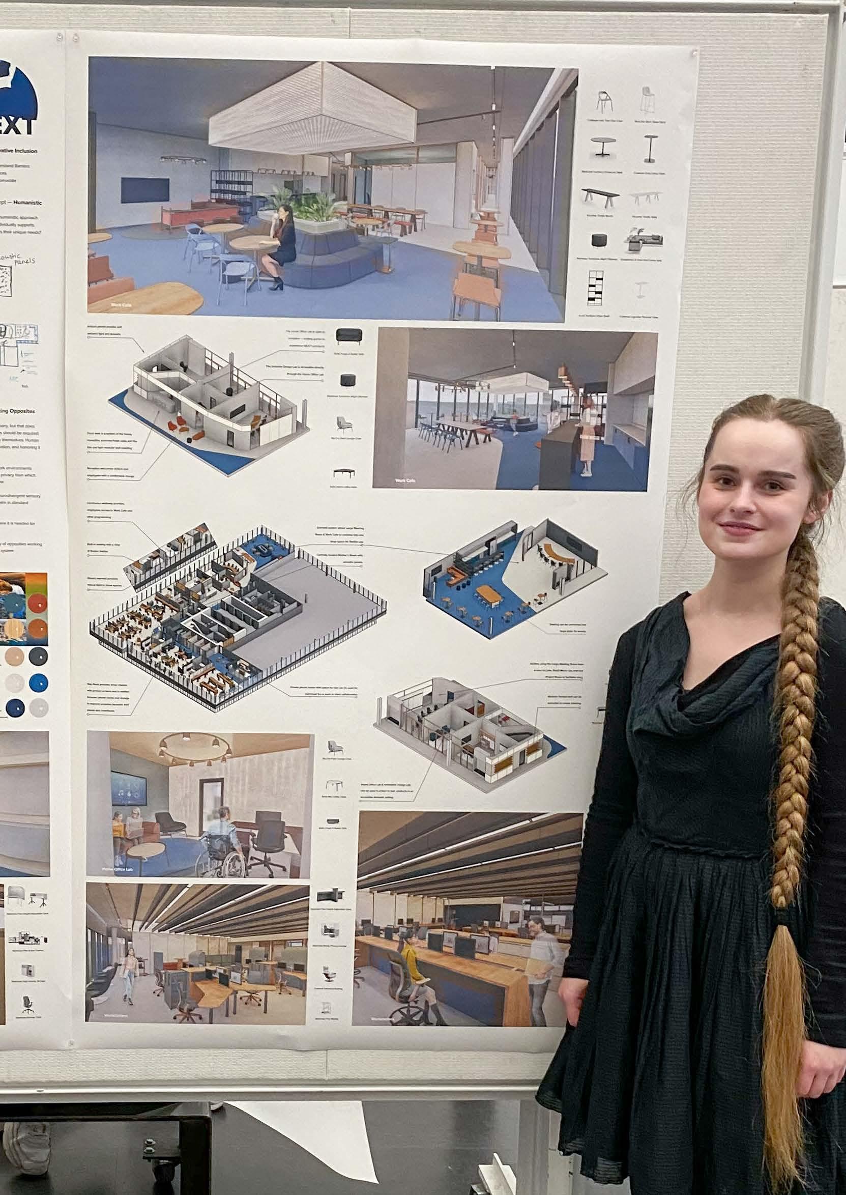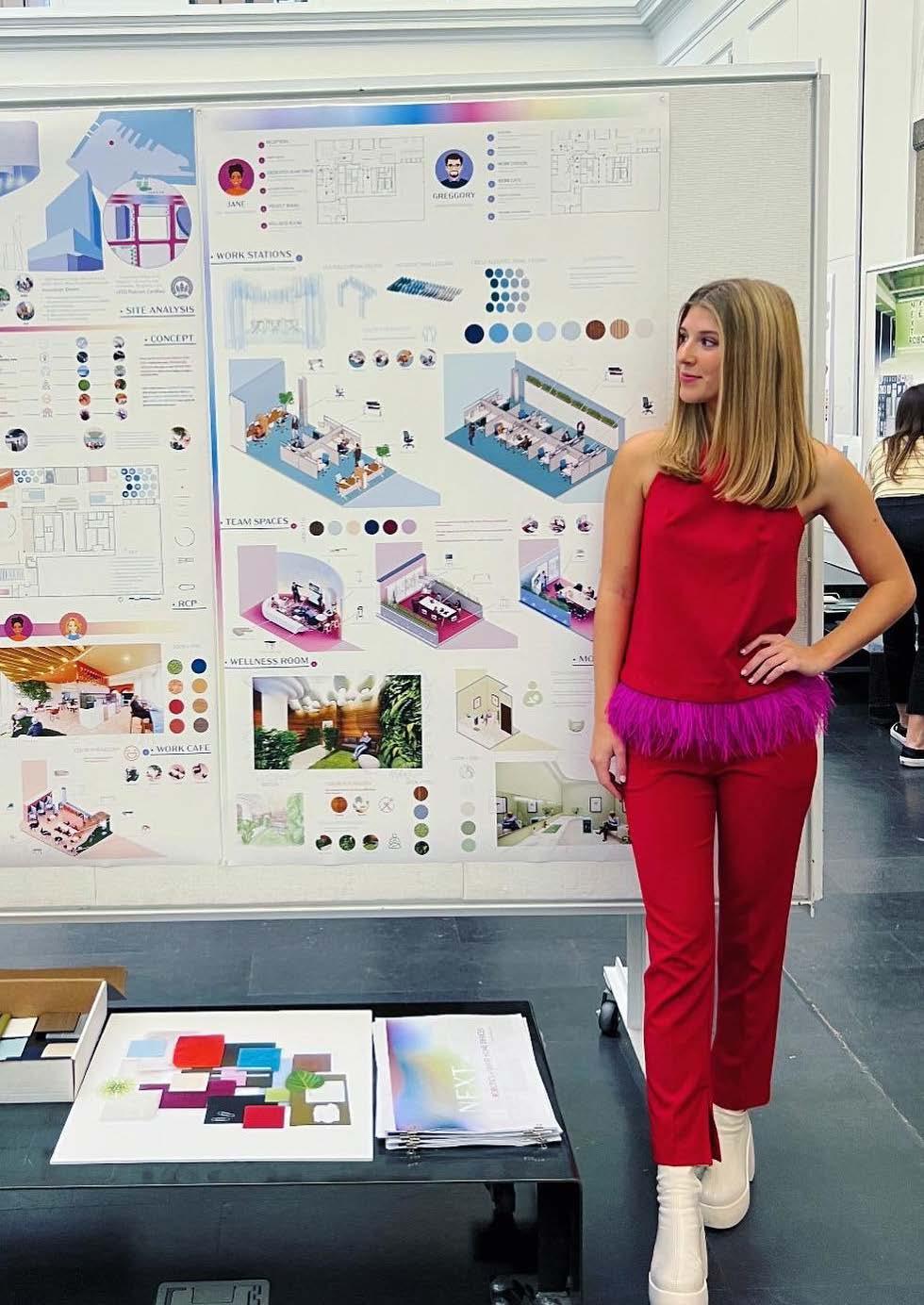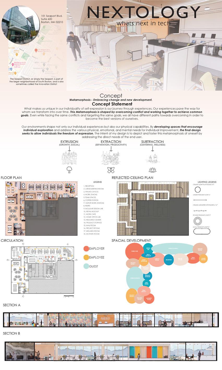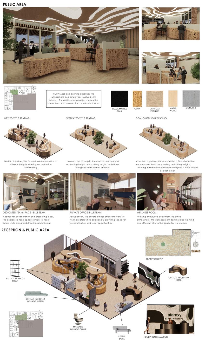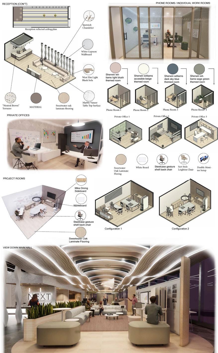 I thoroughly enjoyed every project as they explored and dove deep into the complex reality of a forever changing workplace design after a pandemic. It is encouraging to see design concepts that capture a well-rounded brand but also create a functional space for the end users. When developing these concepts, I encourage the students to dig deeper into the meaning of every element within every space. How can these elements become functional yet stay aesthetically pleasing for the overall brand? I encourage to think outside of the box and stretch the boundaries of the asked points of the client. How can you make what the client needs more intriguing yet functional? Critically develop the design concept and allow it to initiate & dwell in the rest of the design. Good luck to all students!