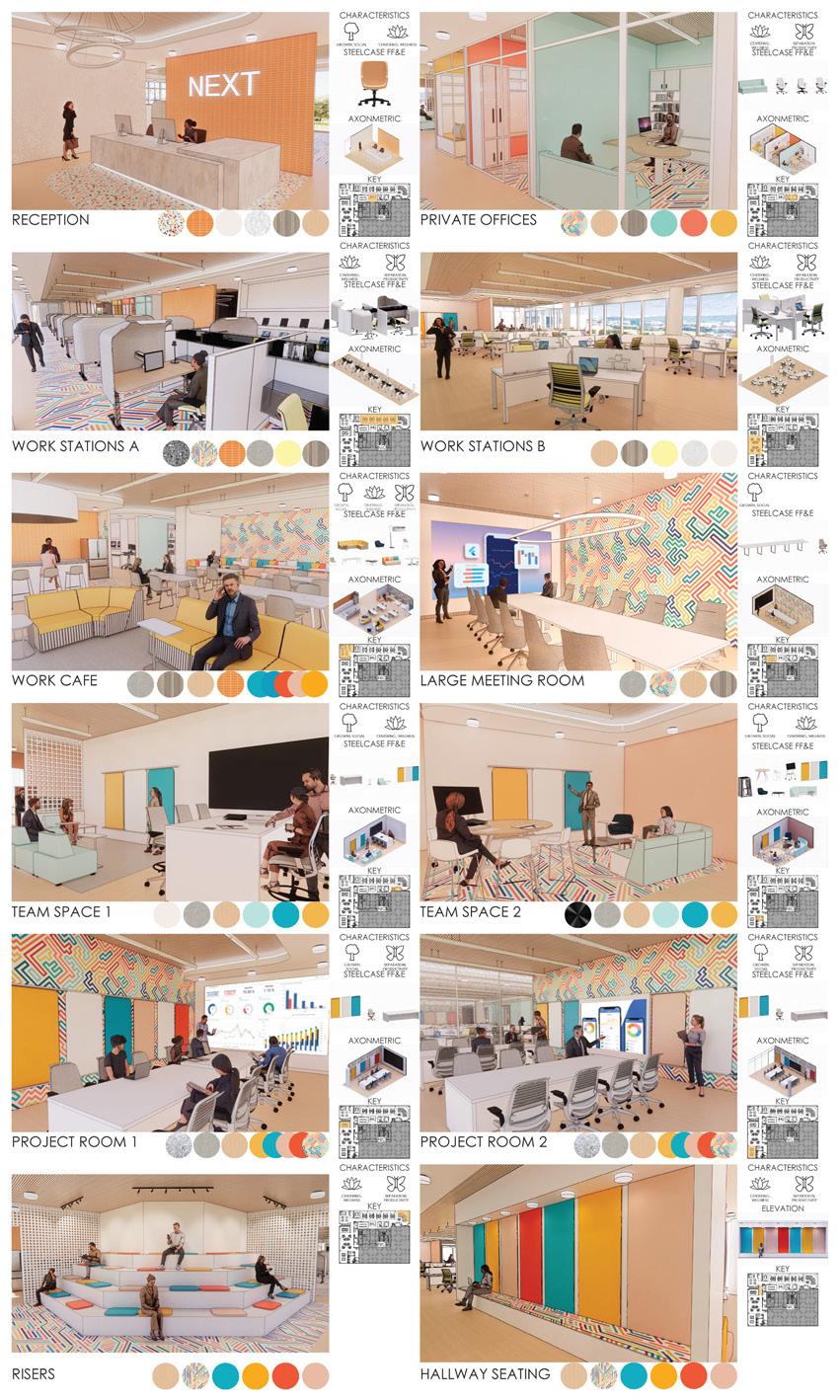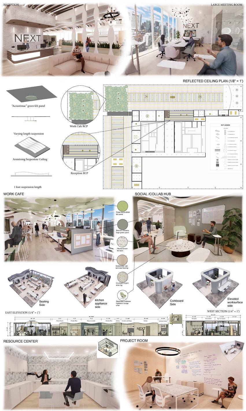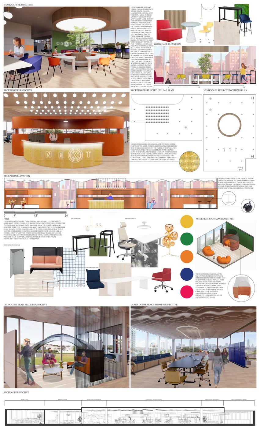 Students in this studio created a workplace environment consisting of approximately 12.000 square feet in order to address changing work behaviors and expectations of the future workplace based on the 2022 Steelcase NEXT Student Design Competition. A combination of the Chicago field trip, 36 assignments, and 3 reviews were supported to complete their projects.