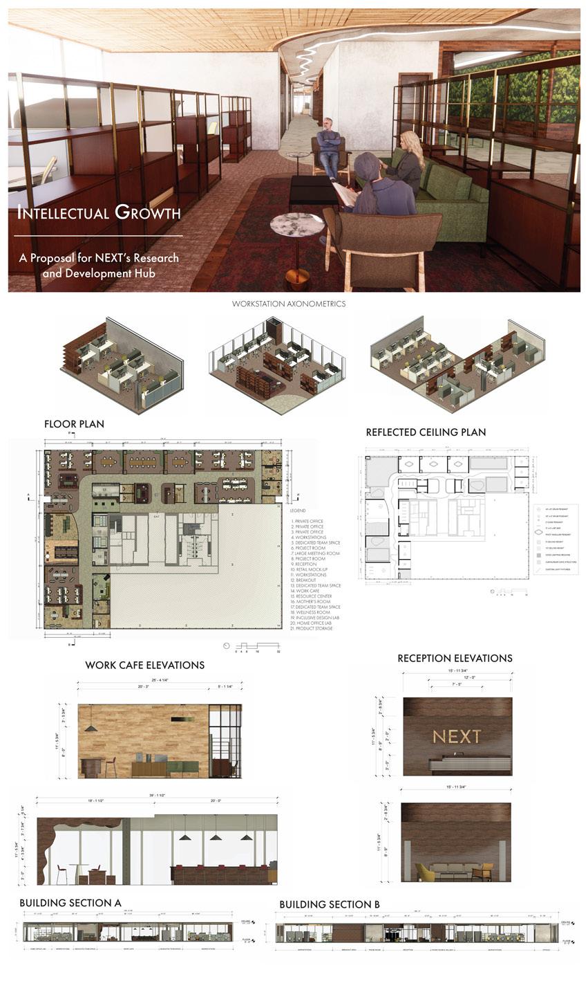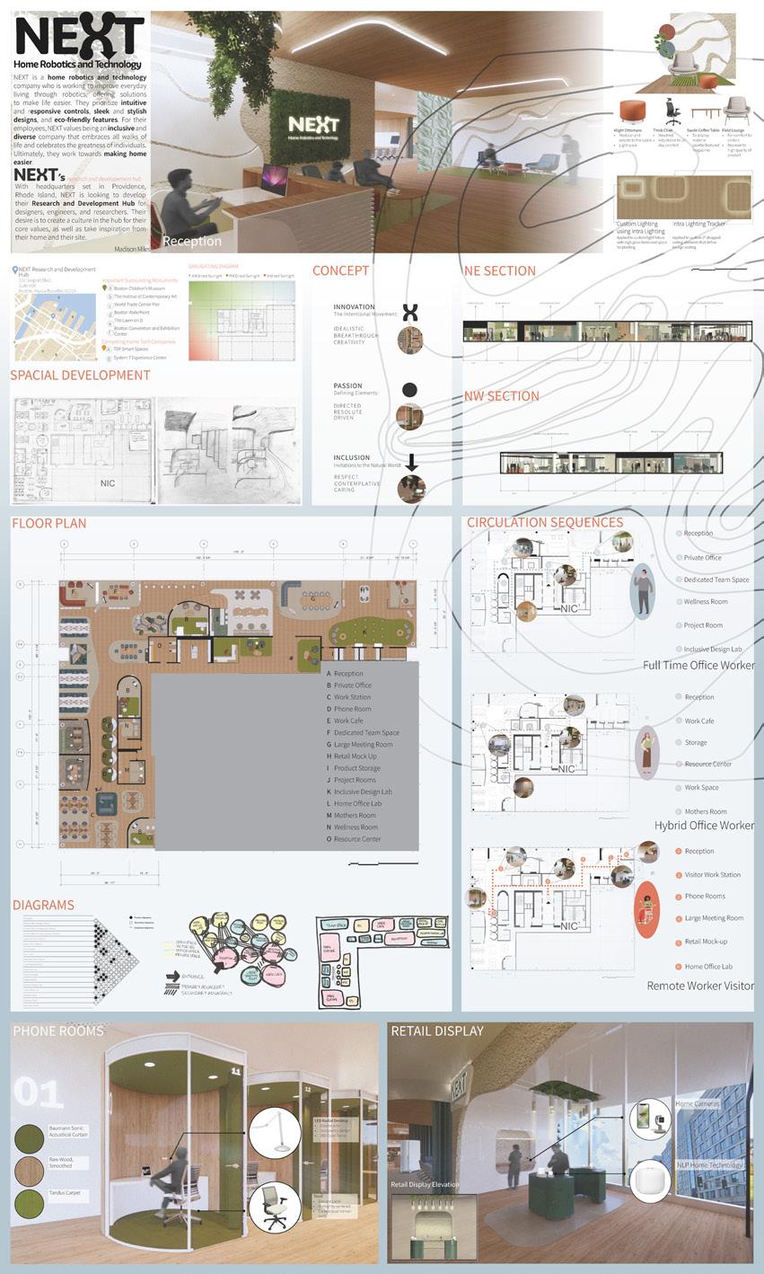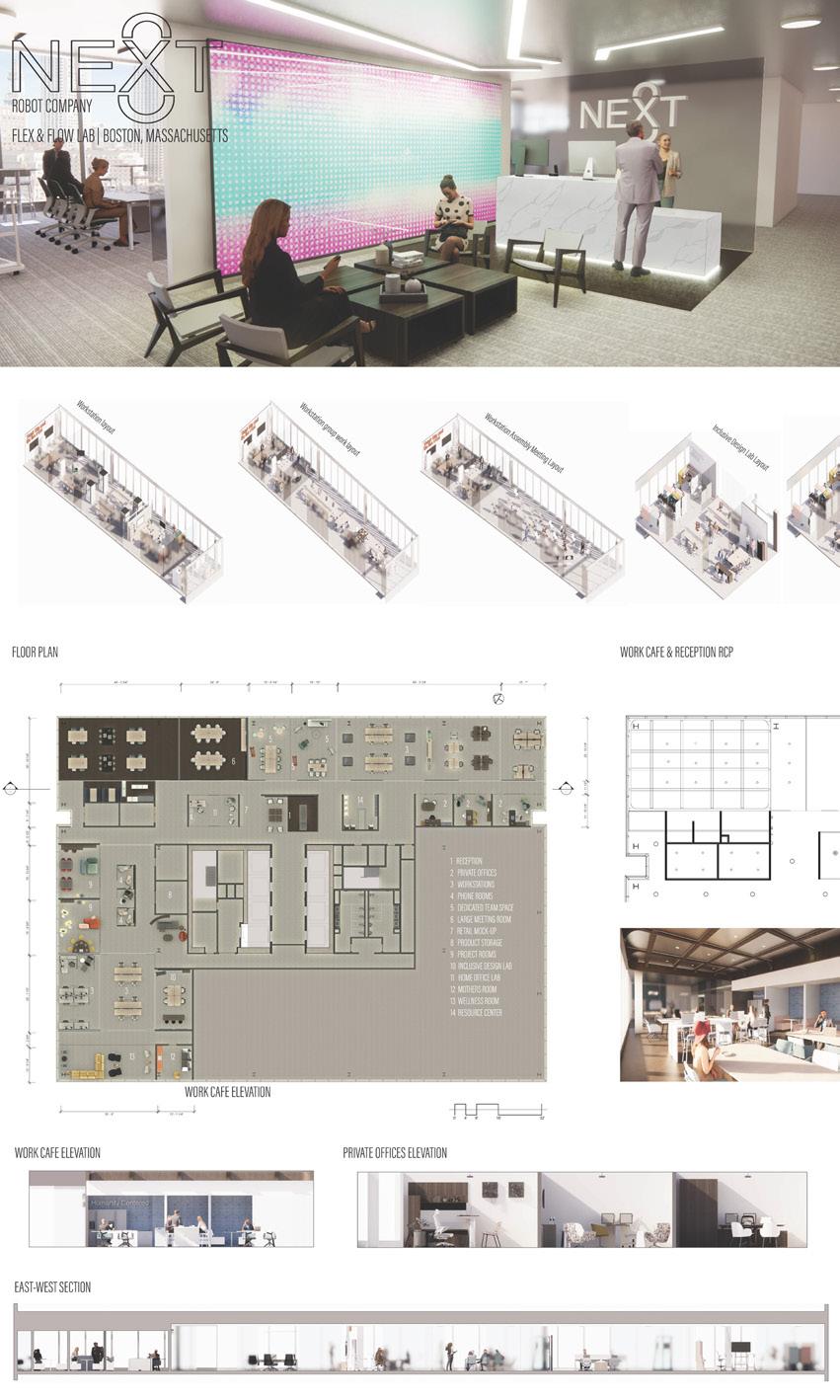 Students in this studio created a workplace environment consisting of approximately 12.000 square feet in order to address changing work behaviors and expectations of the future workplace based on the 2022 Steelcase NEXT Student Design Competition. A combination of the Chicago field trip, 36 assignments, and 3 reviews were supported to complete their projects.