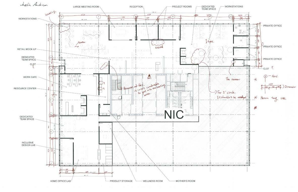 1. Keep the core visible not hatched out as NIC!: These are shared public areas and understanding how access is provided for entry sequence, alignments and experiences, egress and toilet facilities is part of the workplace design and should not be negated, even on a shared tenant floor. Thought should be given to the entry view FROM the elevator core, as a first impression experience for the visitor, and how it owns the entry itself for that purpose