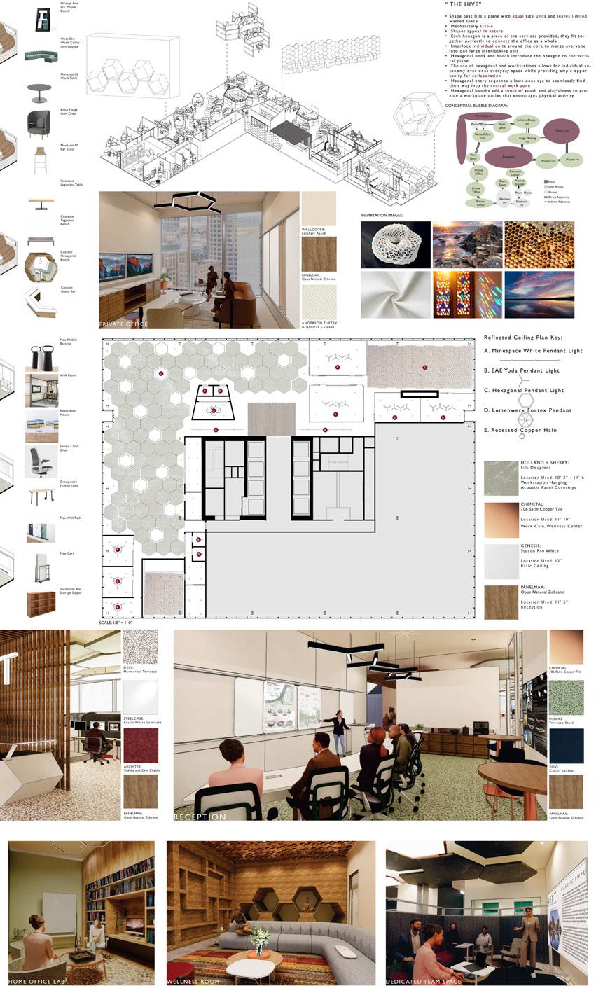 4. Edit: There is a tendency to want to use design moves, materials and/or furniture layouts that reflect Workplace, Design Media and Pinterest trends but do not necessarily support the unique needs of a specific client’s program, brand, service and/or product focus or demographic. Be careful of these traps, as they may seem to represent creative thinking in design, but actually show a lack of creativity in designing individually crafted client driven solutions. This also applies to materials and finishes. There was a good deal of work that suffered with too many finishes, and/or materials.
