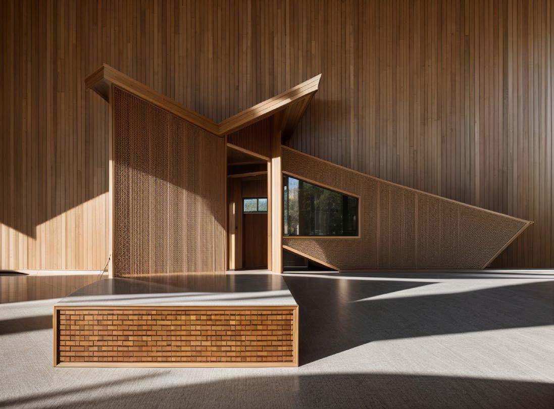 The architectural design consists of a voxel style building with light wood louvers as its primary façade element. The building is made of darker grey concrete and complimented by dark wood.