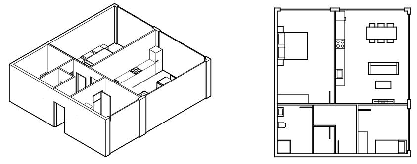 - This project uses the “Woods” floor plan for a two bedroom apartment from Southyard Lofts and recreates a two bedroom using the same boundary of the floor plan. The Plan Finder plan differs from the Woods plan in its placement of the woods and orientation of the kitchen and living room as well as the bedrooms and entry sequence. The kitchen and living room are placed on the back wall in a linear open layout where one passes the bedrooms and bathrooms before getting to the living room. The PlanFinder plan features a half bath that is not present in the Woods. The placement of the windows and faces of the facade could be controlled and the outcome could be more similiar to that of the Woods but I chose to not have a preference of facade to see what the PlanFinder would show me.