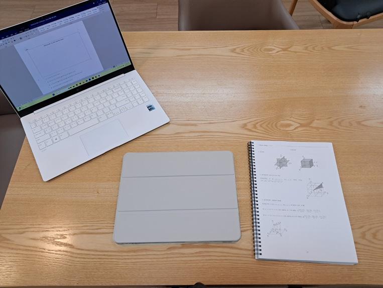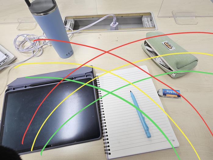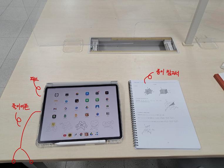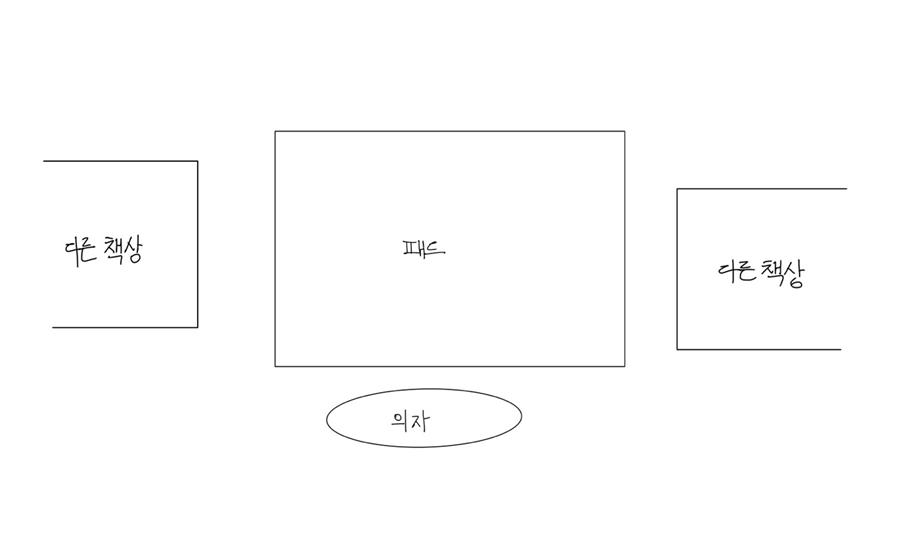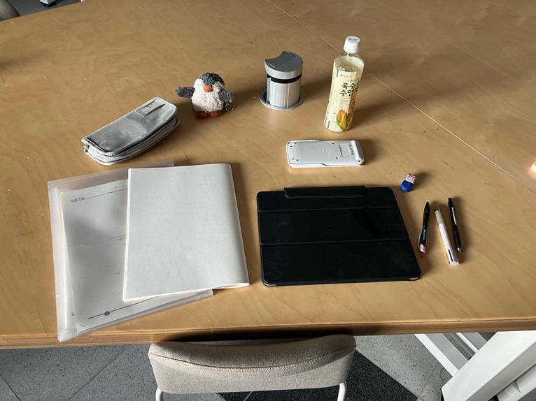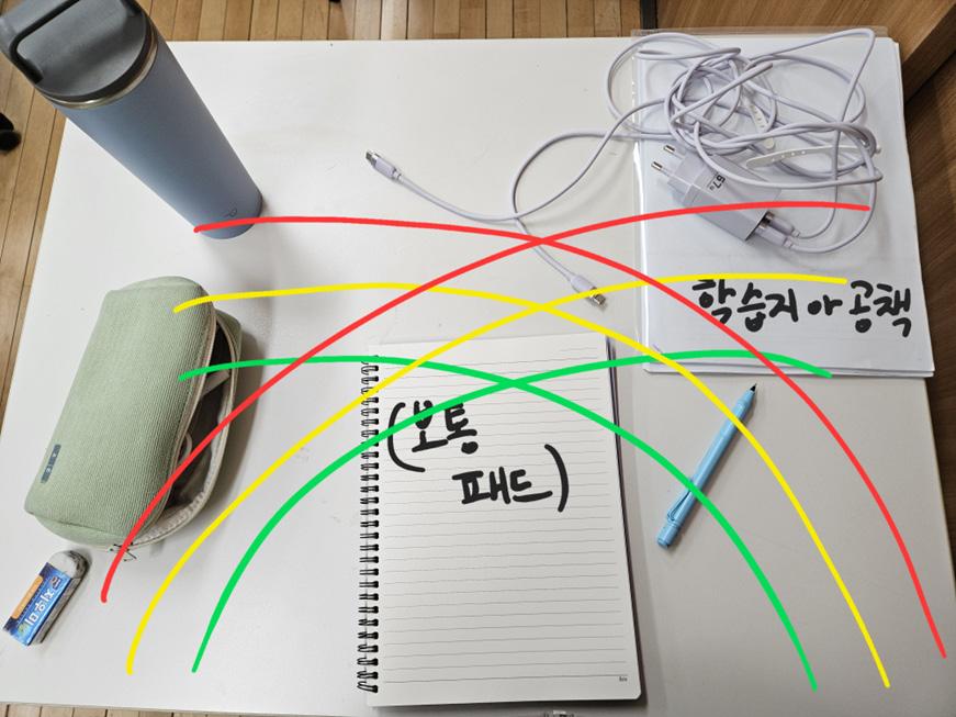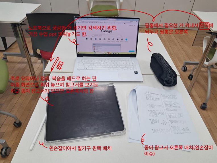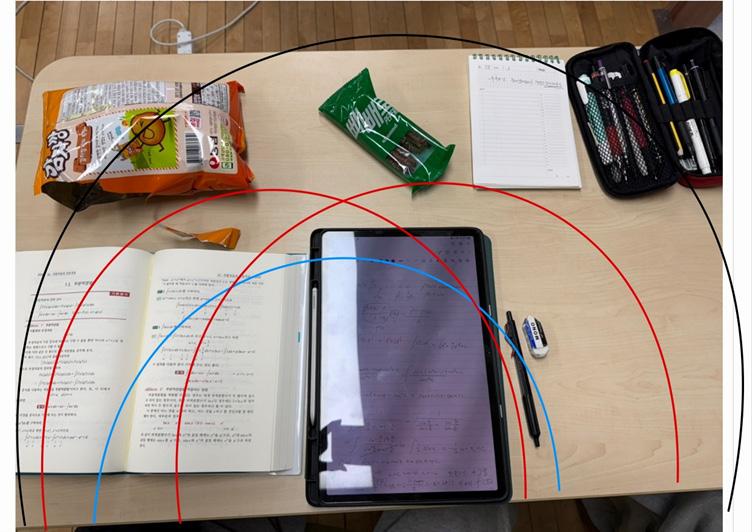 5. 이 장소에서 (4) 목적을 위해 활동할 때 환경 조건 (예. 노래듣기, 헤드폰 혹은 이어폰, 스마트폰 위치, 등등) 은 어떠한 것들이 있습니까? 책상의 넓이가 가로로 넓은 편이라 필통이나 노트 등 비교적 필요 없는 물건들을 멀리 배치해두는 편입니다. 화학 수업을 듣고, 화학 수업에는 특히 공학용계산기를 많이 사용하기 때문에 그림에는 표현이 되어있지 않지만 펜의 자리 바로 옆에 계산기를 두고 이용합니다. 노래를 들을 때도 있는데, 보통 간단한 화학양론 계산 문제를 풀 때 듣고 집중이 필요한 어려운 문제를 풀 때에는 듣지 않고 헤드폰으로 노이즈 캔슬링만 이용합니다.
