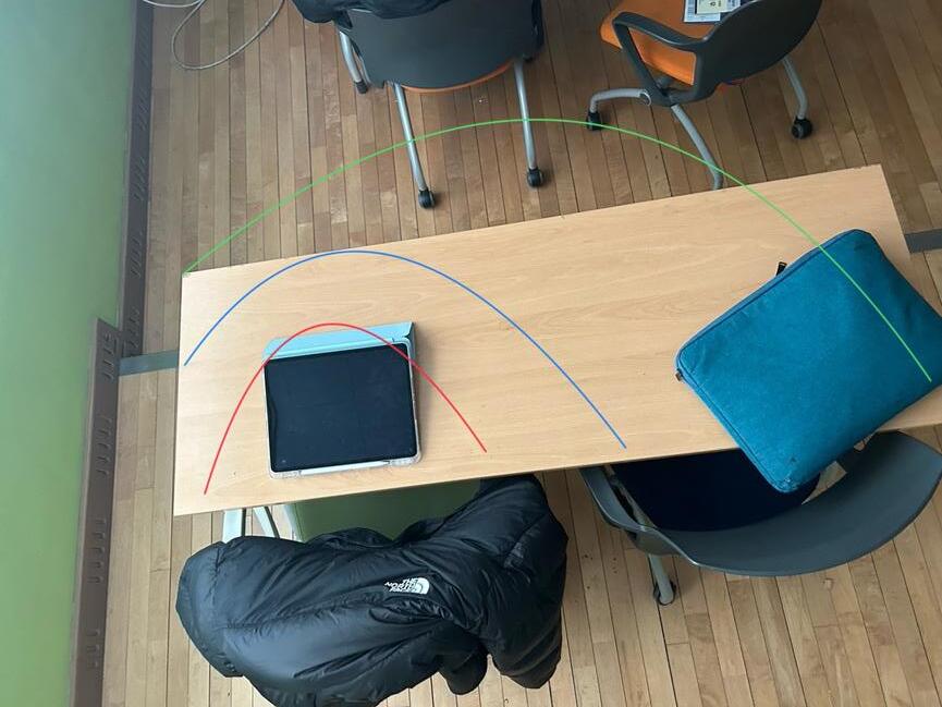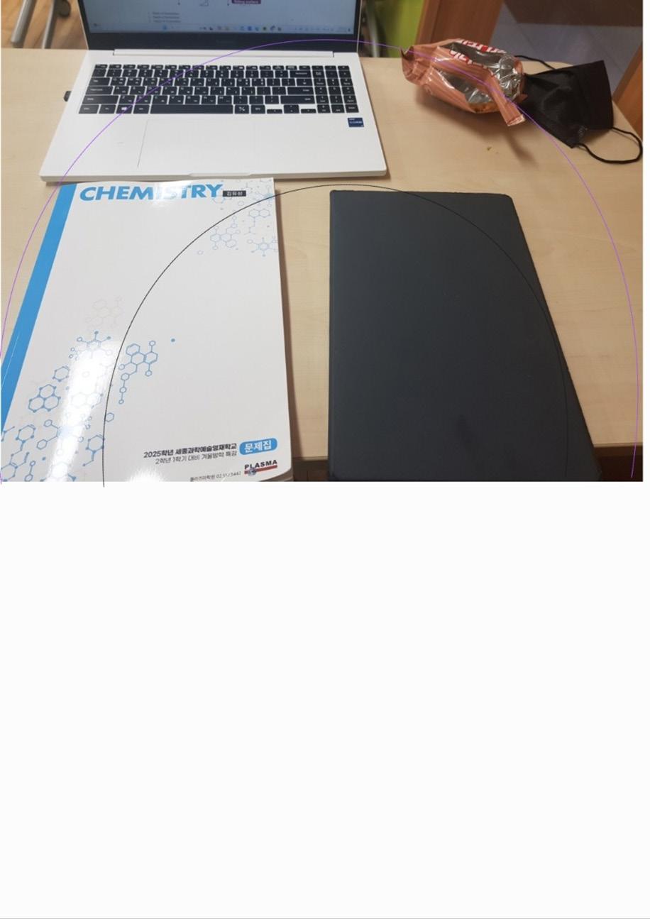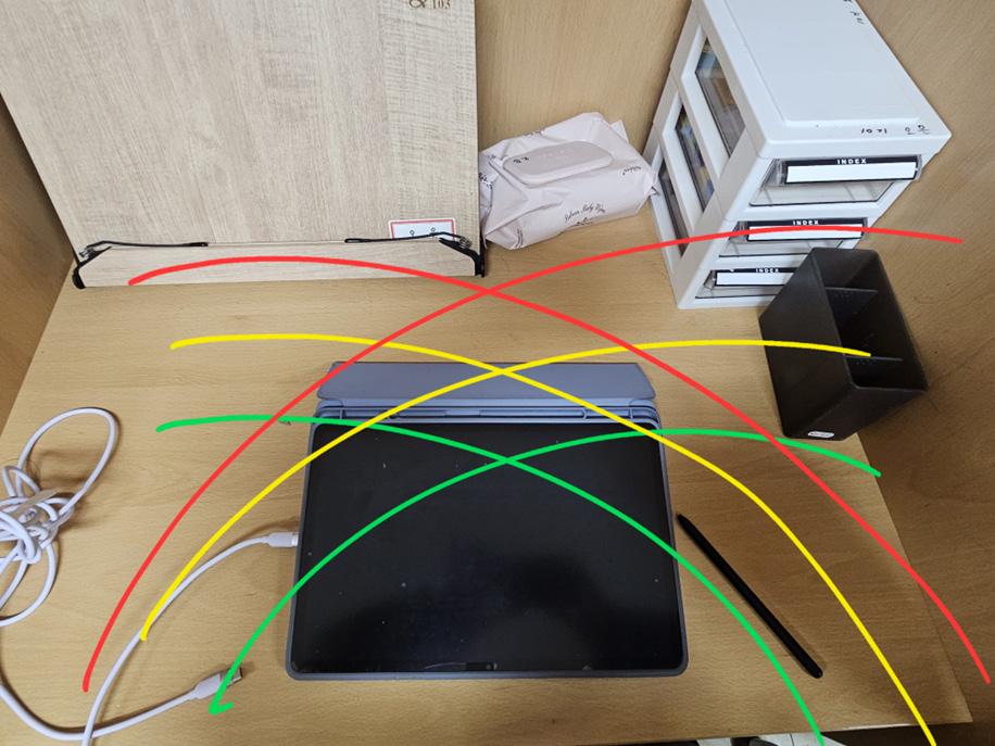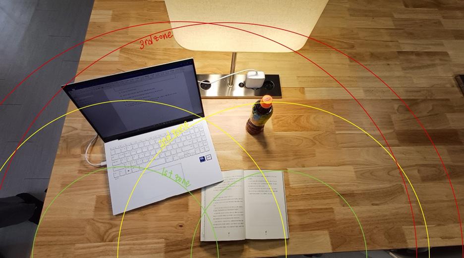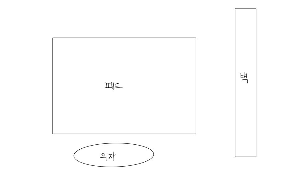 5. 이 장소에서 (4) 목적을 위해 활동할 때 환경 조건 (예. 노래듣기, 헤드폰 혹은 이어폰, 스마트폰 위치, 등등) 은 어떠한 것들이 있습니까? 책상의 넓이가 가로로 넓은 편이라 필통이나 노트 등 비교적 필요 없는 물건들을 멀리 배치해두는 편입니다. 화학 수업을 듣고, 화학 수업에는 특히 공학용계산기를 많이 사용하기 때문에 그림에는 표현이 되어있지 않지만 펜의 자리 바로 옆에 계산기를 두고 이용합니다. 노래를 들을 때도 있는데, 보통 간단한 화학양론 계산 문제를 풀 때 듣고 집중이 필요한 어려운 문제를 풀 때에는 듣지 않고 헤드폰으로 노이즈 캔슬링만 이용합니다.