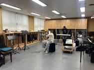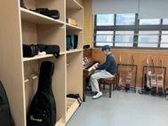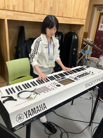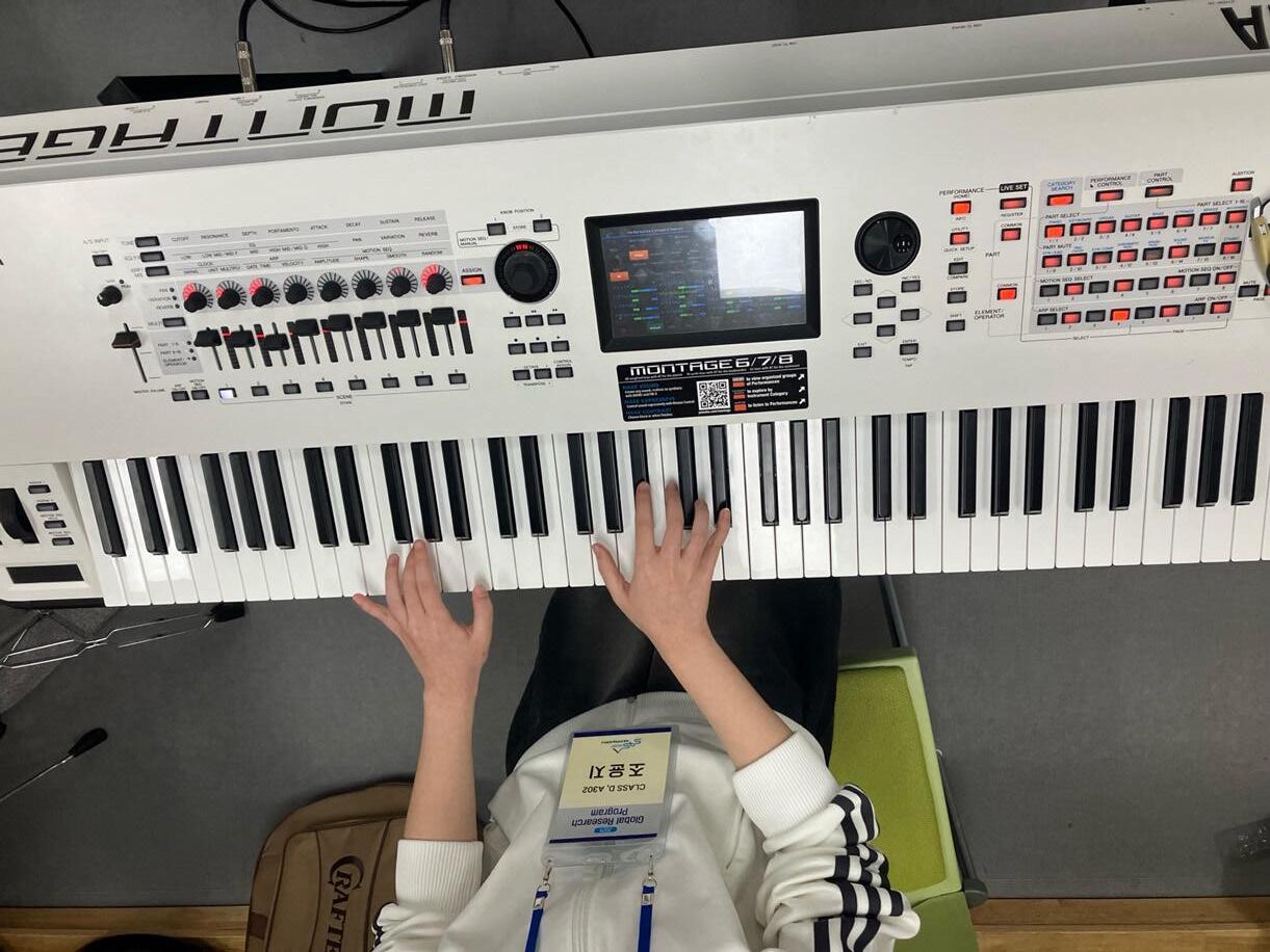 피실험자 #1: 악기 연습 경험이 거의 없음 건반 악기를 서서 연주함 뒤의 벽면에 악기가 수납