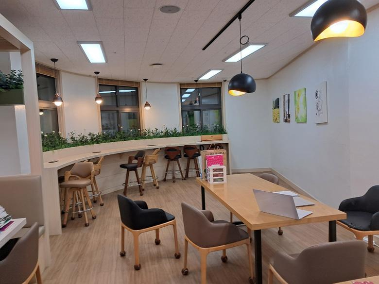 1. 이 장소는 어디인가요? 기숙사 5층 휴게실(카페테리아 느낌)