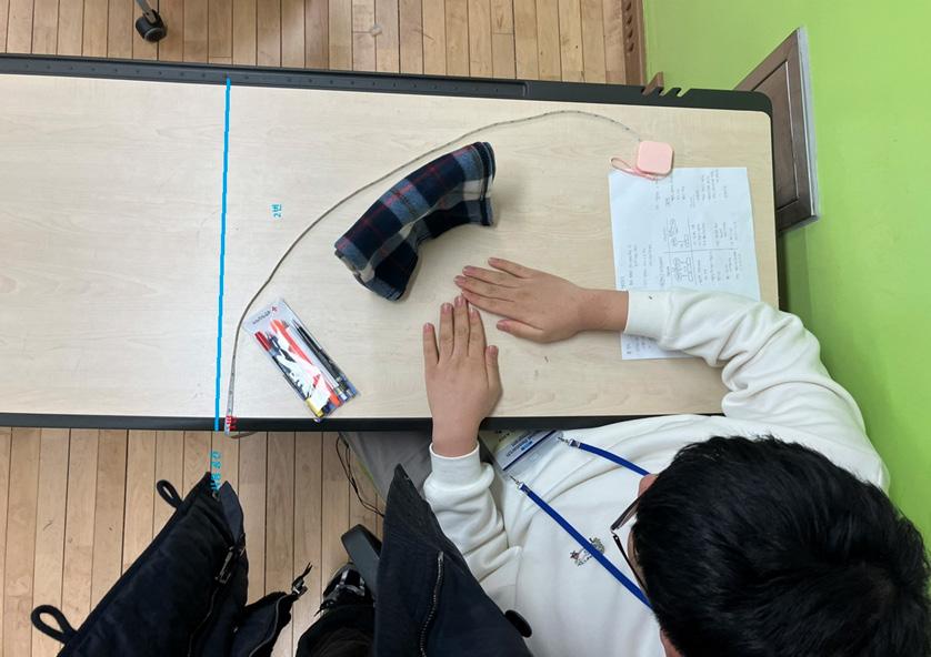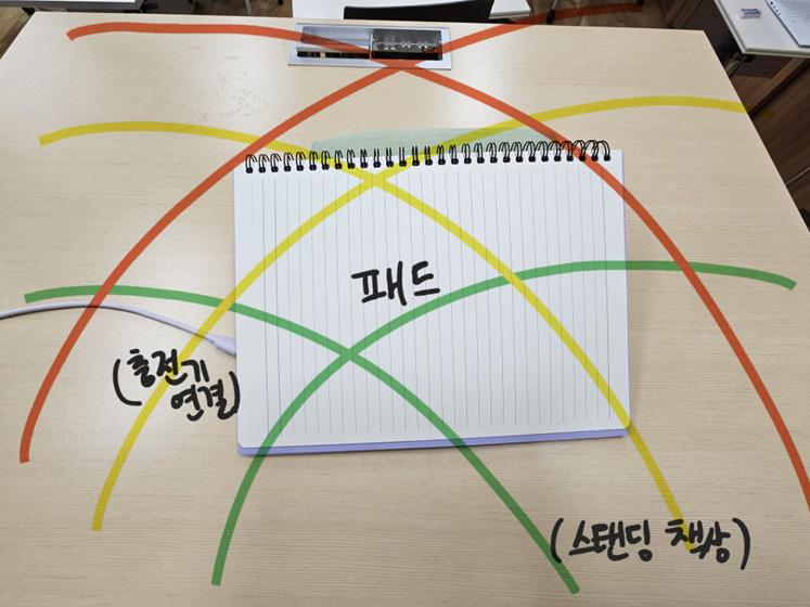 5. 이 장소에서 (4) 목적을 위해 활동할 때 환경 조건 (예. 노래듣기, 헤드폰 혹은 이어폰, 스마트폰 위치, 등등) 은 어떠한 것들이 있습니까? 담요는 아이패드, 종이는 공책, 연필 뭉치는 필통을 대신하고, 모두 1번 구역에 있다.