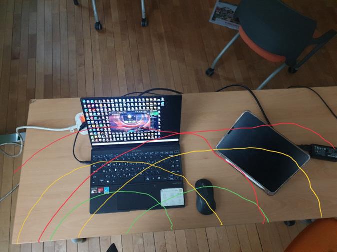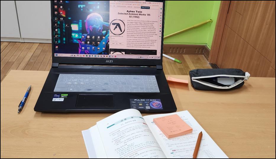 5. 이 장소에서 (4) 목적을 위해 활동할 때 환경 조건 (예. 노래듣기, 헤드폰 혹은 이어폰, 스마트폰 위치, 등등) 은 어떠한 것들이 있습니까? 노트북과 스마트폰을 같이 올려둔다. 스마트폰은 책의 왼쪽(노트북 아래)에 주로 둔다. 촬영 때문 에 휴대폰은 사진에 없다. 필통은 가로로 두는 것 같다. 필통과 노트북 사이에는 주로 메모지나 수정 테이프와 지우개 를 둔다.