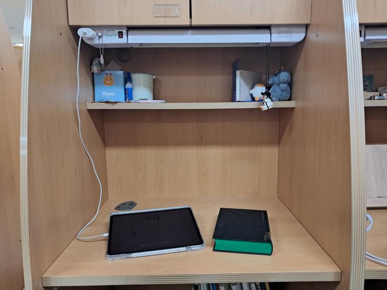 5. 이 장소에서 (4) 목적을 위해 활동할 때 환경 조건 (예. 노래듣기, 헤드폰 혹은 이어폰, 스마트폰 위치, 등등) 은 어떠한 것들이 있습니까? 협소한 장소여서 노트북 배치 불가; 무선 이어폰으로 노래를 들음 (노래를 듣기 위함 보단 노이즈 캔슬링 목적이 강함); 담요를 몸에 두르고 함(가을, 겨울 한정); 의자에 방석이 있음; 전자기기는 충전기와 가까운 왼 쪽에 배치; 필기구는 오른쪽; 안경닦이는 왼쪽 위; 교과서는 여닫이 서랍에 넣어 평소엔 넣어두다가 필요할 때 꺼냄