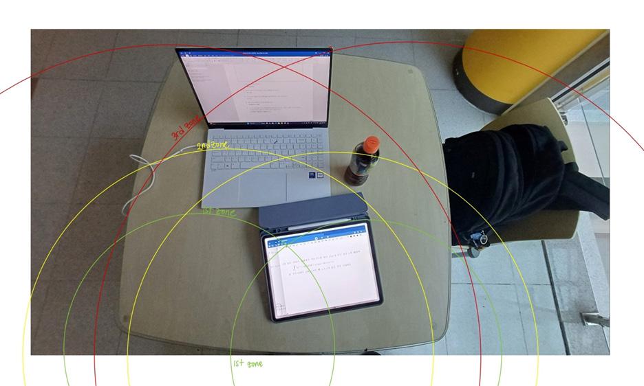 5. 이 장소에서 (4) 목적을 위해 활동할 때 환경 조건 (예. 노래듣기, 헤드폰 혹은 이어폰, 스마트폰 위치, 등등) 은 어떠한 것들이 있습니까? 공강시간에는 보통 이어폰으로 노래를 듣는다. 핸드폰은 패드 오른쪽에 두는 것 같다.