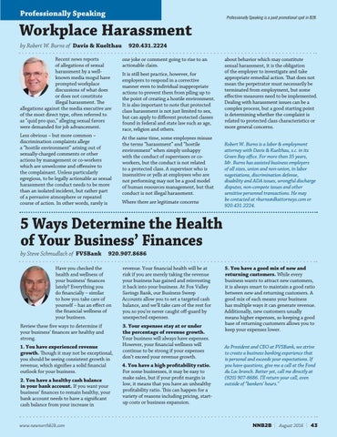 Workplace Harassment by Robert W. Burns of Davis & Kuelthau Recent news reports of allegations of sexual harassment by a wellknown media mogul have prompted workplace discussions of what does or does not constitute illegal harassment. The allegations against the media executive are of the most direct type, often referred to as “quid pro quo,” alleging sexual favors were demanded for job advancement. Less obvious − but more common − discrimination complaints allege a “hostile environment” arising out of sexually-charged comments or other actions by management or co-workers which are unwelcome and offensive to the complainant. Unless particularly egregious, to be legally actionable as sexual harassment the conduct needs to be more than an isolated incident, but rather part of a pervasive atmosphere or repeated course of action. In other words, rarely is