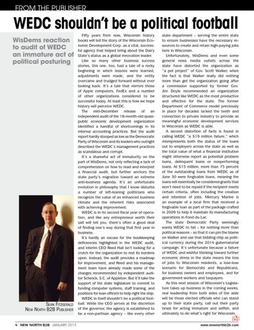 state department – serving the entire state to ensure businesses have the necessary resources to create and retain high-paying jobs here in Wisconsin. Unfortunately, WisDems and even some general news media outlets across the state have distorted the organization as “a pet project” of Gov. Scott Walker, when the fact is that Walker really did nothing more than get the organization going after a commission supported by former Gov. Jim Doyle recommended an organization structured like WEDC as the most productive and effective for the state. The former Department of Commerce model previously in place for decades lacked the teeth and connection to private industry to provide as meaningful economic development services in Wisconsin as WEDC is able. A second distortion of facts is found in calling WEDC “a $19 million failure,” which misrepresents both the status of the loans out to employers across the state as well as the total value of what a financial institution might otherwise report as potential problem loans, delinquent loans or nonperforming loans. At $15 million, more than 75 percent of the outstanding loans from WEDC as of June 30 were forgivable loans, meaning the loans will essentially be considered grants that won’t need to be repaid if the recipient meets certain criteria, often including the creation and retention of jobs. Mercury Marine is an example of a local firm that received a forgivable loan as part of the package crafted in 2009 to help it maintain its manufacturing operations in Fond du Lac. The state Democratic Party seemingly wants WEDC to fail – for nothing more than political reasons – so that it can pin the blame on Walker and use that bidding chip as political currency during the 2014 gubernatorial campaign. It’s unfortunate because a failure of WEDC and wishful thinking toward further economic stress in the state means the loss of jobs to Wisconsin residents, a lose-lose scenario for Democrats and Republicans, for business owners and employees, and for government workers and taxpayers. As this next session of Wisconsin’s Legislature takes up business in the coming weeks, real leadership from both sides of the aisle will be those elected officials who can stand up to their state party, call out their party brass for acting immature and selfish, and ultimately to do what’s right for Wisconsin. www.newnorthb2b.com