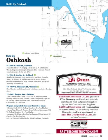 8 - 3500 N. Main St., Oshkosh Bemis Healthcare Packaging, a 162,790-sq. ft. addition to the existing manufacting facility and office complex. Project completion expected in late 2015. 9 - 1530 S. Koeller St., Oshkosh Noodles & Company, Sports Authority and Ross Dress for Less, a 42,200-sq. ft. multi-tenant retail center. Project completion expected in May. General contractor is Bayland Buildings of Green Bay. 10 - 1500 S. Washburn St., Oshkosh FloorQuest, a multi-tenant retail building to include a flooring store. 11 - 2601 Badger Ave., Oshkosh Tube Fabrication & Color, a 7,500-sq. ft. addition to the existing manufacturing facility. Project completion expected in January. General contractor is Frontier Builders & Consultants of Kaukauna. Projects completed since our December issue: • Holiday Ford, 390 N. Rolling Meadows Dr., Fond du Lac. • Love’s Travel Stop & Country Store/Subway Restaurant, 191 W. Rolling Meadows Dr., Fond du Lac. • Agnesian Healthcare/Fond du Lac Regional Clinic South, 321 Camelot Dr., Fond du Lac. • City of Oshkosh Public Works, 639 Witzel Ave., Oshkosh.