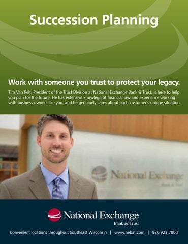 Work with someone you trust to protect your legacy. Tim Van Pelt, President of the Trust Division at National Exchange Bank & Trust, is here to help you plan for the future. He has extensive knowlege of ďŹ nancial law and experience working with business owners like you, and he genuinely cares about each customer’s unique situation.