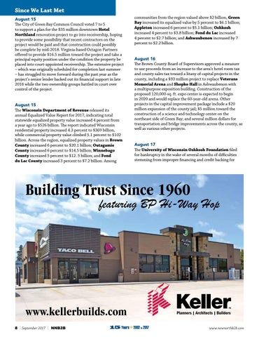 communities from the region valued above $2 billion, Green Bay increased its equalized value by 5 percent to $6.1 billion; Appleton increased 6 percent to $5.1 billion; Oshkosh increased 4 percent to $3.8 billion; Fond du Lac increased 4 percent to $2.7 billion; and Ashwaubenon increased by 7 percent to $2.2 billion. August 16 The Brown County Board of Supervisors approved a measure to use proceeds from an increase to the area’s hotel room tax and county sales tax toward a litany of capital projects in the county, including a $93 million project to replace Veterans Memorial Arena and Shopko Hall in Ashwaubenon with a multipurpose exposition building. Construction of the proposed 120,000-sq. ft. expo center is expected to begin in 2020 and would replace the 60-year-old arena. Other projects in the capital improvement package include a $20 million expansion of the county jail; $5 million toward the construction of a science and technology center on the northeast side of Green Bay; and several million dollars for transportation and bridge improvements across the county, as well as various other projects. August 17 The University of Wisconsin Oshkosh Foundation filed for bankruptcy in the wake of several months of difficulties stemming from improper financing and credit backing for