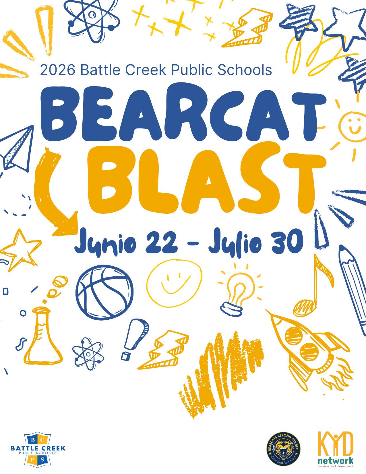 Bearcat Blast es el programa de verano de Battle Creek Public Schools donde los estudiantes pueden aprender, hacer nuevos amigos y vivir experiencias inolvidables. Con excursiones, actividades diver tidas y apoyo académico, cada día es una nueva aventura.