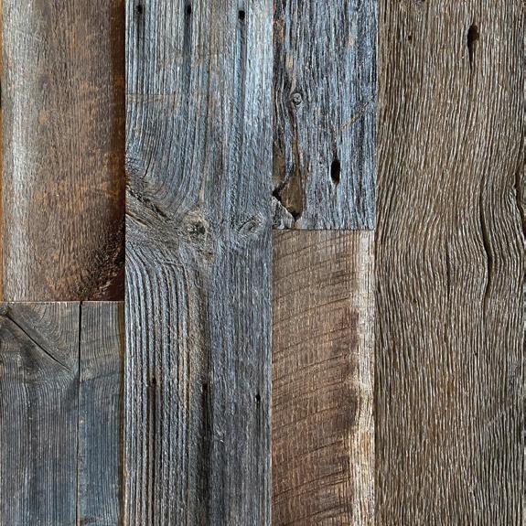 Our take on barn wood paneling is broad and dynamic in scope. We incorporate wood that is salvaged not just from barns, but also from agricultural fencing and other structures that have endured the elements. Weathered Grey is sorted for a mix of tones from silver to charcoal, selected from the boards that spent their previous life standing up to the elements and oxidizing to the perfect blend of greys. Brown Board features rich tones and a variety of original textures: planed, rough sawn, and lightly weathered. Taphouse is a mix of Weathered Grey and Brown Board. Redwood features a consistent width and shorter lengths, perfect for paneling. Corral Board is also consistent in width, with long lengths of silver patina pocked with brown—a memory from life as fencing.