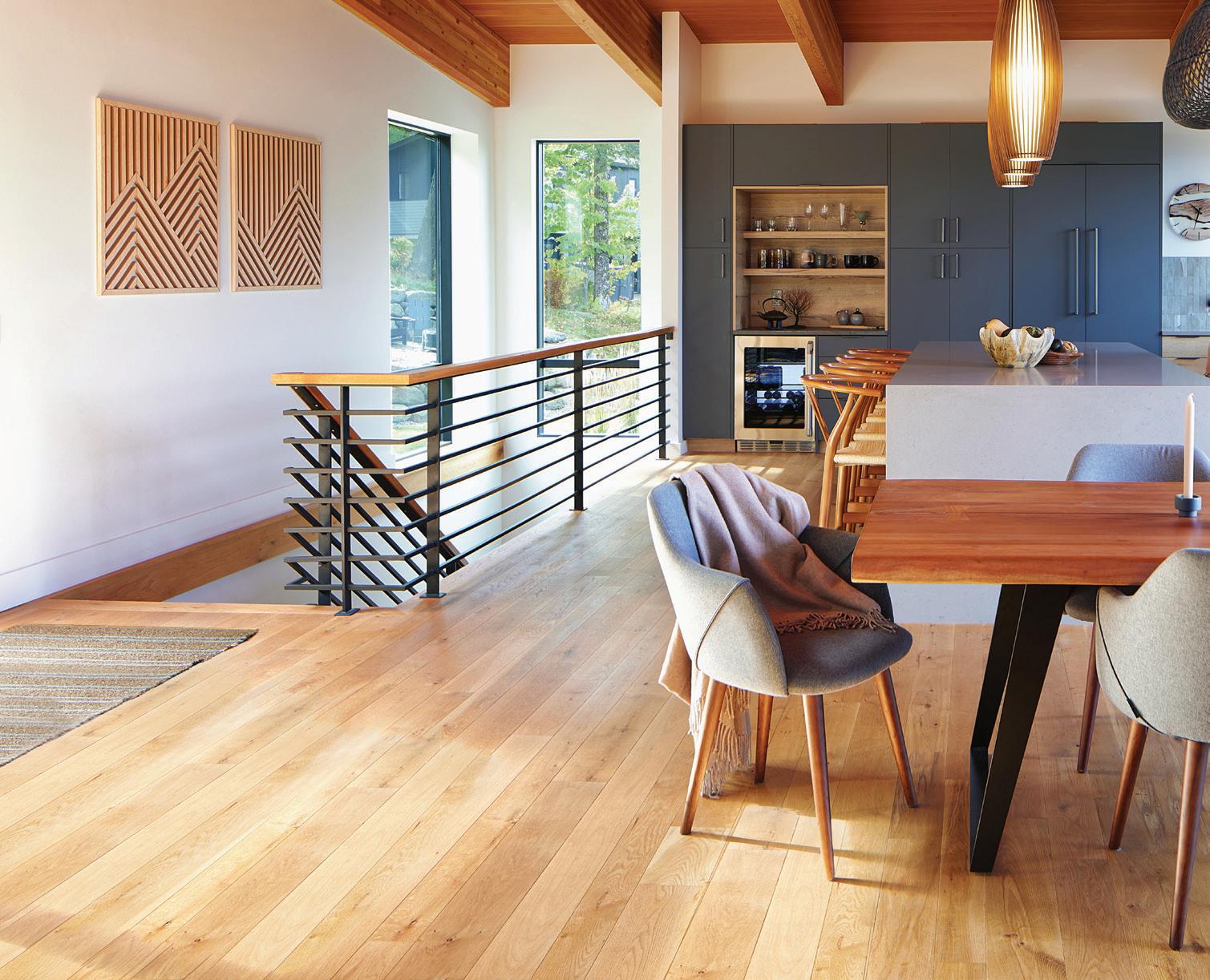 As you enter the house proper the chic look and wide warmth of our FSC-Certified Casual White Oak flooring celebrates biophilia through its natural fresh-sawn tones and consistent hues while pairing effortlessly with the Douglas Fir glulam structure and tasteful industrial components.