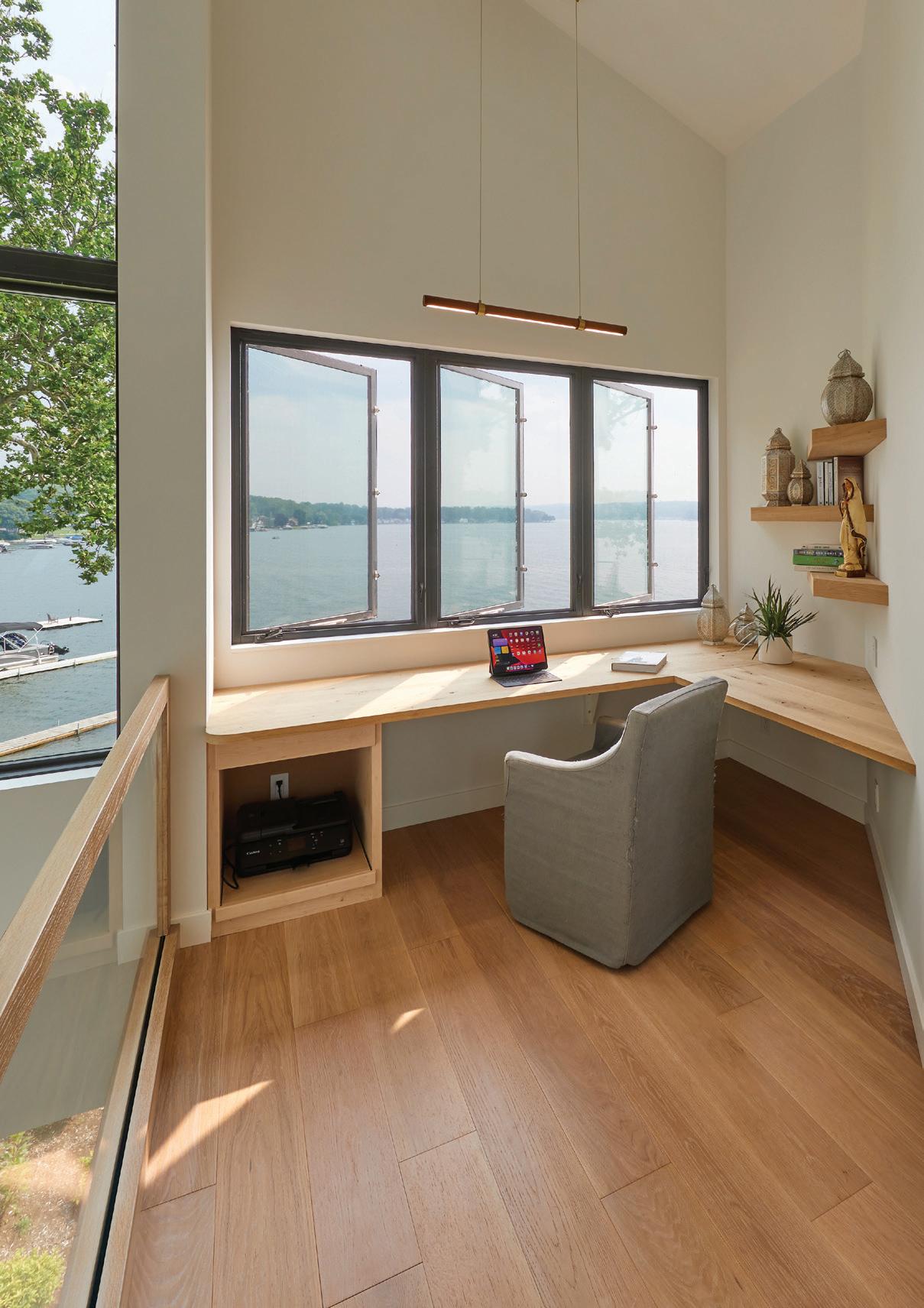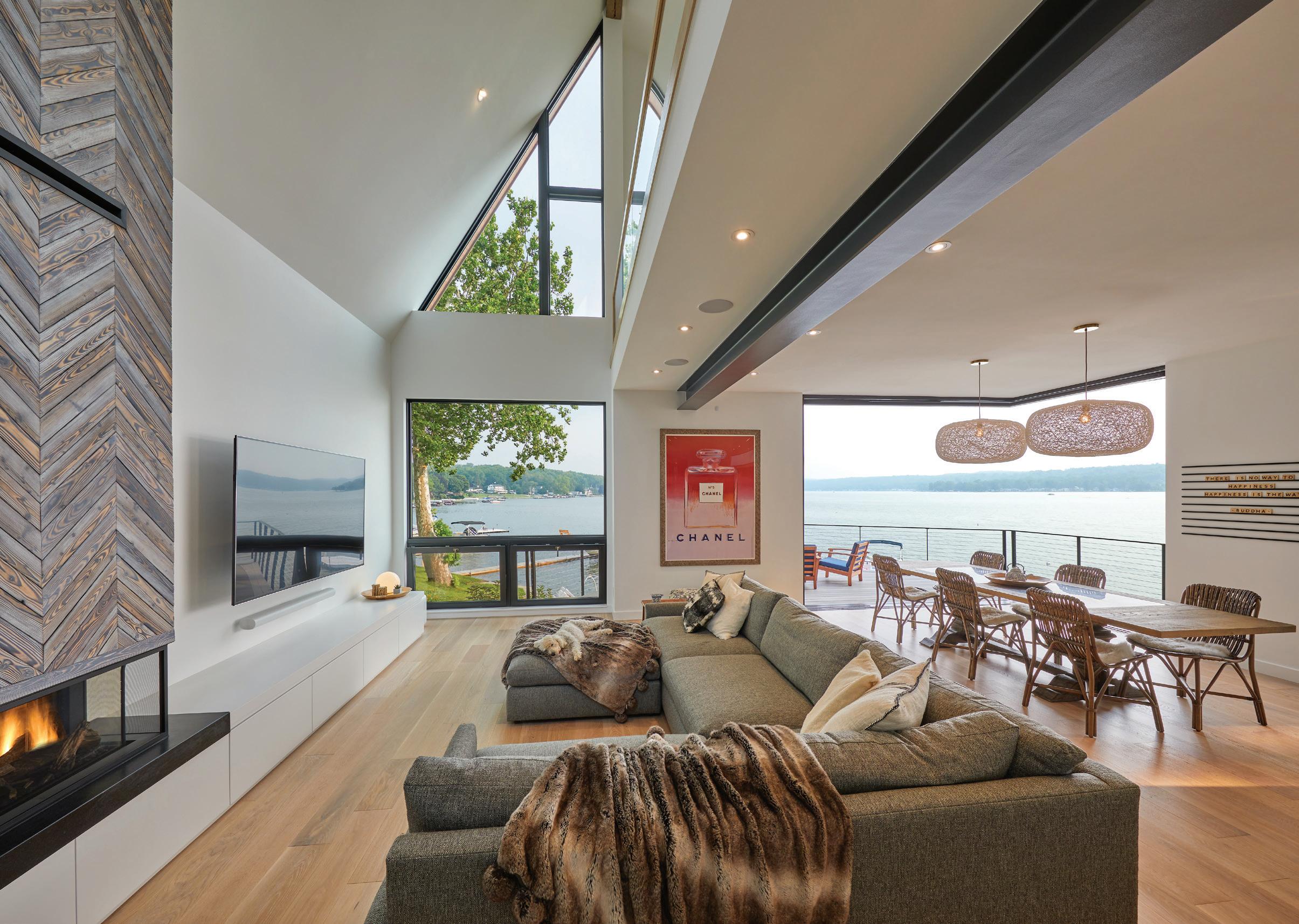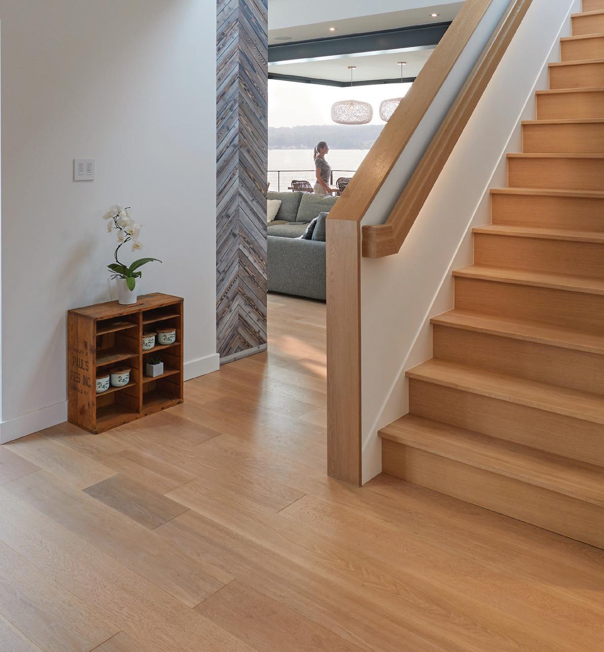 Nestled on the bank of a New York Finger Lake, this waterside home is all classic finishes with a modern point of view. Sustainably harvested Modern Farmhouse White Oak unites the rooms with its wide 8” planks. To add softness, it’s finished in a 5% white hardwax oil. This lends an airiness to the rooms, inspired by the lake views and the calming lapping of the wake.