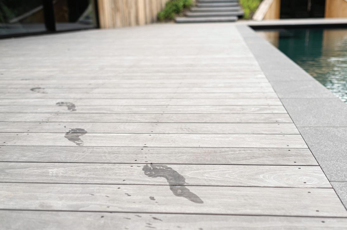 Guaranteed to last for years to come, our Accoya® Color Grey Decking is stable and ensures minimal movement. This allows for increased performance in high-moisture and high traffic settings, especially pool side—just like the day it was installed.