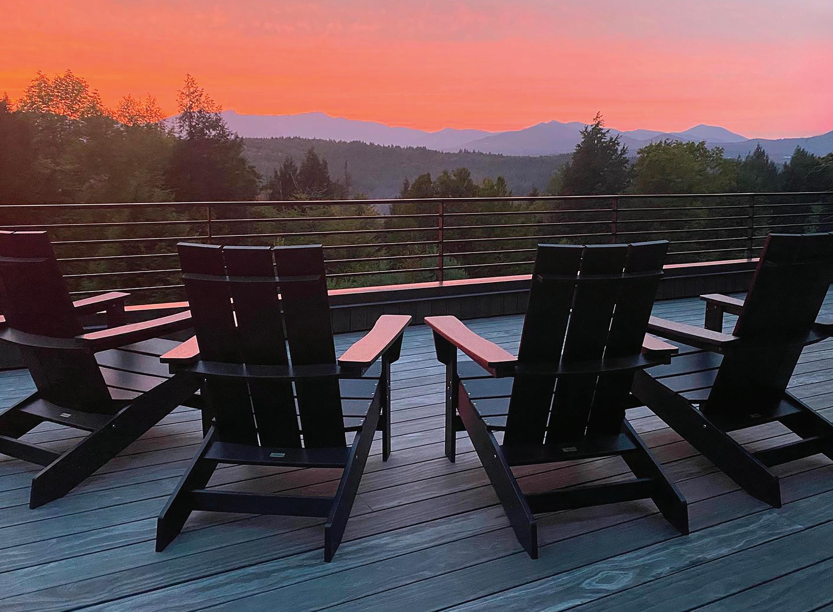 between the home’s large scale industrial elements and the softer biophilic interior choices. It assimilates with the roof lines, porch, timbers, and the surrounding Green Mountain landscape collaborating every component into a unified artistic statement.