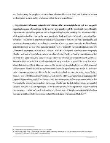 and the tendency for people to sponsor those who look like them, Black and Latino/a/x leaders are hampered in their ability to advance within their organizations. 7. Organizations Influenced by Dominant Cultures – The cultures of philanthropic and nonprofit organizations are often driven by the norms and practices of the dominant race/ethnicity. Organizations often have policies and/or longstanding ways of working that are dictated by a white dominant culture that can be unwelcoming to Black and Latino/a/x leaders, deeming them as “other.” That so much organizational culture is deemed to be based on white perspective and experience is no surprise – according to a number of surveys, more than 9 in 10 philanthropic organizations are led by a white person; similarly, 10% of nonprofit executive leadership and 18% of nonprofit employees are Black and Latino/a/x. Only 8% of nonprofit board members are people of color, and 30% of boards lack a single member of color. Finally, 63% of organizations say that diversity is a core value, but the percentage of people of color on nonprofit boards and CEO/ Executive Director roles has not changed significantly in at least 15 years.25 In many instances, attempts to address these situations focus on the leaders, seeking to find ways to help them adapt to the culture. But this establishes a premise that the challenge is based on a deficit of the leader, rather than recognizing a need to make the organizational culture more inclusive. Aaron Walker, Founder and CEO of Camelback Ventures, which aims to address inequities in entrepreneurship by providing coaching, capital, and connections to underrepresented entrepreneurs, asserts that “racism is the groundwater, and we, the people of color are the fish. Interventions are created with the idea that it is a ‘fish problem’ – with the idea of ‘let’s fix entrepreneurs of color to make them stronger… when we’re still swimming in polluted waters.’ People must reconcile with how they are upholding white supremacy culture through their practices and beliefs.”26
