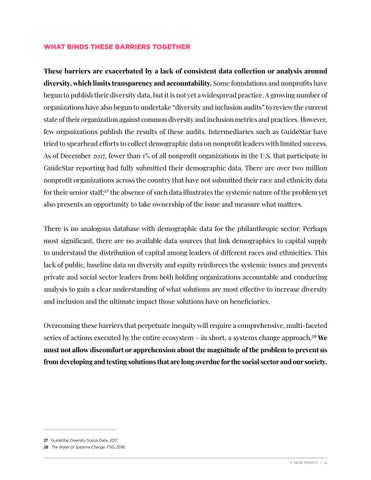 WHAT BINDS THESE BARRIERS TOGETHER These barriers are exacerbated by a lack of consistent data collection or analysis around diversity, which limits transparency and accountability. Some foundations and nonprofits have begun to publish their diversity data, but it is not yet a widespread practice. A growing number of organizations have also begun to undertake “diversity and inclusion audits” to review the current state of their organization against common diversity and inclusion metrics and practices. However, few organizations publish the results of these audits. Intermediaries such as GuideStar have tried to spearhead efforts to collect demographic data on nonprofit leaders with limited success. As of December 2017, fewer than 1% of all nonprofit organizations in the U.S. that participate in GuideStar reporting had fully submitted their demographic data. There are over two million nonprofit organizations across the country that have not submitted their race and ethnicity data for their senior staff;27 the absence of such data illustrates the systemic nature of the problem yet also presents an opportunity to take ownership of the issue and measure what matters. There is no analogous database with demographic data for the philanthropic sector. Perhaps most significant, there are no available data sources that link demographics to capital supply to understand the distribution of capital among leaders of different races and ethnicities. This lack of public, baseline data on diversity and equity reinforces the systemic issues and prevents private and social sector leaders from both holding organizations accountable and conducting analysis to gain a clear understanding of what solutions are most effective to increase diversity and inclusion and the ultimate impact those solutions have on beneficiaries. Overcoming these barriers that perpetuate inequity will require a comprehensive, multi-faceted series of actions executed by the entire ecosystem – in short, a systems change approach.28 We must not allow discomfort or apprehension about the magnitude of the problem to prevent us from developing and testing solutions that are long overdue for the social sector and our society.