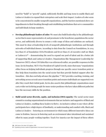 need for “build” or “growth” capital, sufficiently flexible and long-term to enable Black and Latino/a/x leaders to expand their enterprises and scale their impact. Leaders of color seem to be concentrated in smaller nonprofit organizations, and the barriers mentioned above are impediments to their breaking through and establishing institutions that serve communities and individuals in large numbers. • Develop philanthropic leaders of color: We must also build leadership in the philanthropic sector that is more representative of, and proximate to the beneficiary populations the sector serves, and sufficiently diverse to ensure a wide range of ideas and solutions are surfaced. This must be done at leadership levels of nonprofit philanthropic institutions and through networks of individual donors. According to data from the Council on Foundations, in 2014 less than 6% of foundation CEOs/Presidents and fewer than 9% of executive staff are Black or Latino/a/x30 – demonstrating the need to expand our pool of talent and do a better job of supporting Black and Latino/a/x leaders. Organizations like Management Leadership for Tomorrow (MLT), whose CEO John Rice was referenced earlier, are possible responses to this issue. Kevin Donahue, MLT’s Vice President of Capital Growth, states that many “organizations either focus on helping individuals progress through one specific career transition point or they help them transition into the social sector but then provide limited support after the transition – this does not help advance the pipeline.”31 MLT provides coaching, training, and networking across several career transition points and ensures individuals are supported even after they reach their initial goals. Kevin also asserts that philanthropic organizations must cast a wider net in hiring people for more senior positions who have taken different paths but have the necessary skills for the position. • Build social sector diversity, equity, and inclusion (DEI) capacity: The social sector must commit to creating organizational environments that are inclusive and supportive of Black and Latino/a/x leaders, enabling these leaders to thrive. An inclusive culture is one where all the participants have a high degree of familiarity, or understanding and comfort with, Black and Latino/a/x leaders – fostering an environment in which many different innovative ideas can come to fruition. Success in fostering such an environment takes intentional and sustained effort by many people working together. Teach For America saw the impact of these efforts